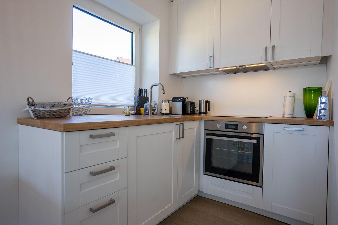 Die Küche ist hell und offen zum Wohnzimmer gestaltet. Hier finden Sie alles was es braucht, um auch im Urlaub entspannt kochen zu können. Vom Wohnzimmer aus haben Sie direkten Zugang zur Terrasse mit Südausrichtung.