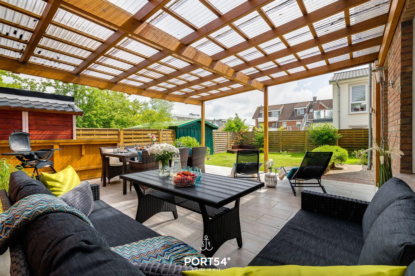 Die Unterkunft "Villa Nova", in absolut zentraler Lage im Zentrum von Büsum, bietet auf 125m² Platz für bis zu 7 Personen. Sie erstreckt sich über zwei Etagen mit einem Wohnbereich, einer Küche, drei Schlafzimmern und zwei Badezimmern. Genießen Sie einen entspannten Abend auf der Couch, die verschiedenen Streaming-Zugänge sorgen für das perfekte Unterhaltungsprogramm. Im Wohnzimmer, der Küche und im oberen Bad sind Alexa Echos vorhanden. Auch die voll ausgestattete Küche mit Magenta-TV lässt keine Wünsche übrig. Die Schlafzimmer besitzen ebenfalls alle einen eigenen TV und für die gute Nachtruhe verdunkelbare Fenster. Im Schlafzimmer im Erdgeschoss befindet sich ein Einzelbett, die im Obergeschoss gelegenen Zimmer verfügen jeweils über ein Doppelbett (160x200cm und 180x200cm). Eine weitere Schlafmöglichkeit bietet die gemütliche Schlafcouch im Wohnbereich. Das im Erdgeschoss gelegene Badezimmer bietet neben einer Dusche auch eine Badewanne. Im Obergeschoss steht eine Dusche zur Verfügung. Lassen Sie Ihren schönen Urlaubstag auf der Terrasse ausklingen und genießen Sie die Abendsonne bei einem Grillabend. Vier Sonnenliegen, eine gemütliche Sitzecke und Lounge, sowie ein Esstisch stehen für Sie bereit. Vor dem Haus befindet sich eine kostenfreie Parkmöglichkeit. Mitgebrachte Fahrräder können Sie im Gartenhaus, oder auf der überdachten Terrasse abstellen.
