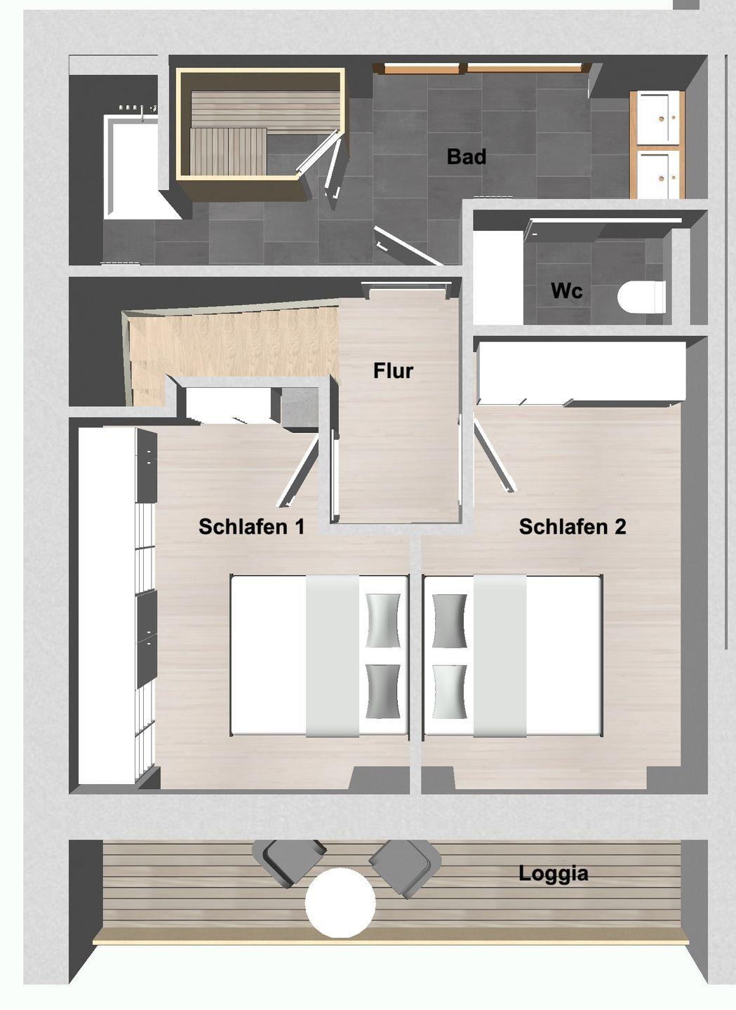 Über zwei Etagen bietet das Ferienhaus auf etwa 106 m² neben drei Schlafzimmern auch zwei Badezimmer, einen großen, lichtdurchfluteten Wohn- und Essbereich mit offener Küche, eine Terrasse und eine Loggia im Obergeschoss. Zwei der drei Schlafzimmer verfügen über Doppelbetten, das dritte bietet ein Einzelbett. Auf der Loggia können Sie herrlich entspannen und Ihre Urlaubstage ausklingen. Ein Stellplatz ist vor dem Haus vorhanden.