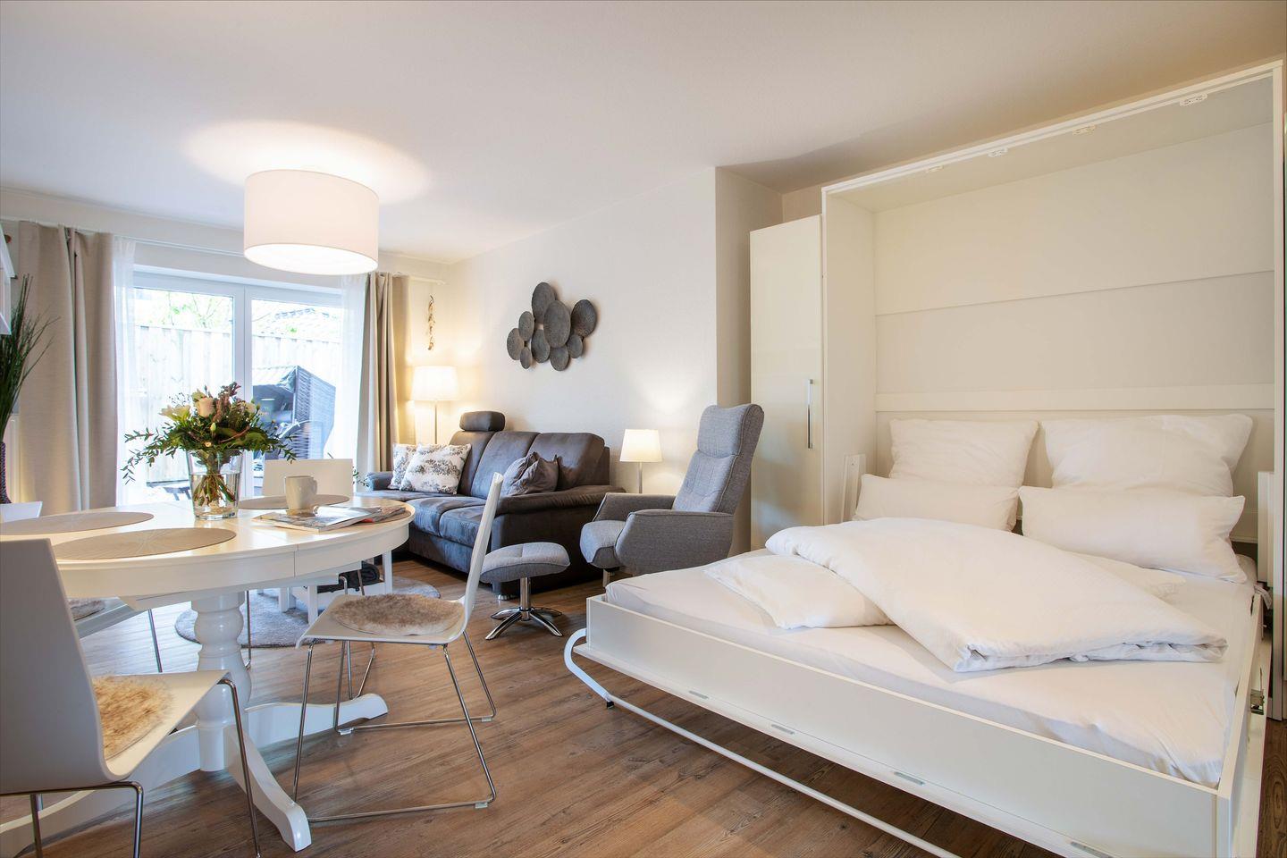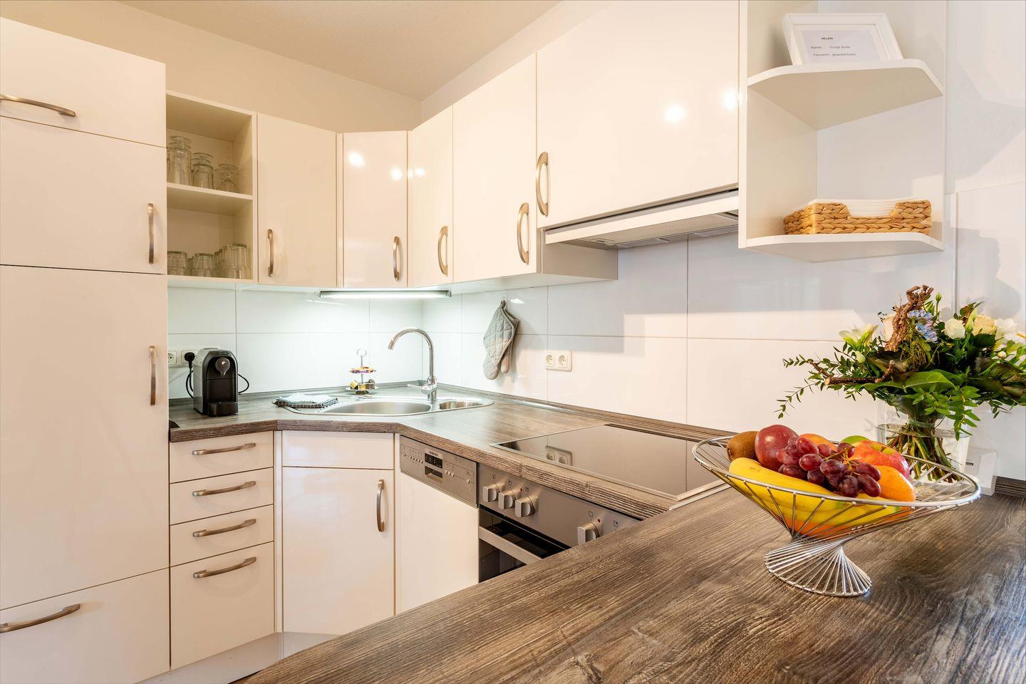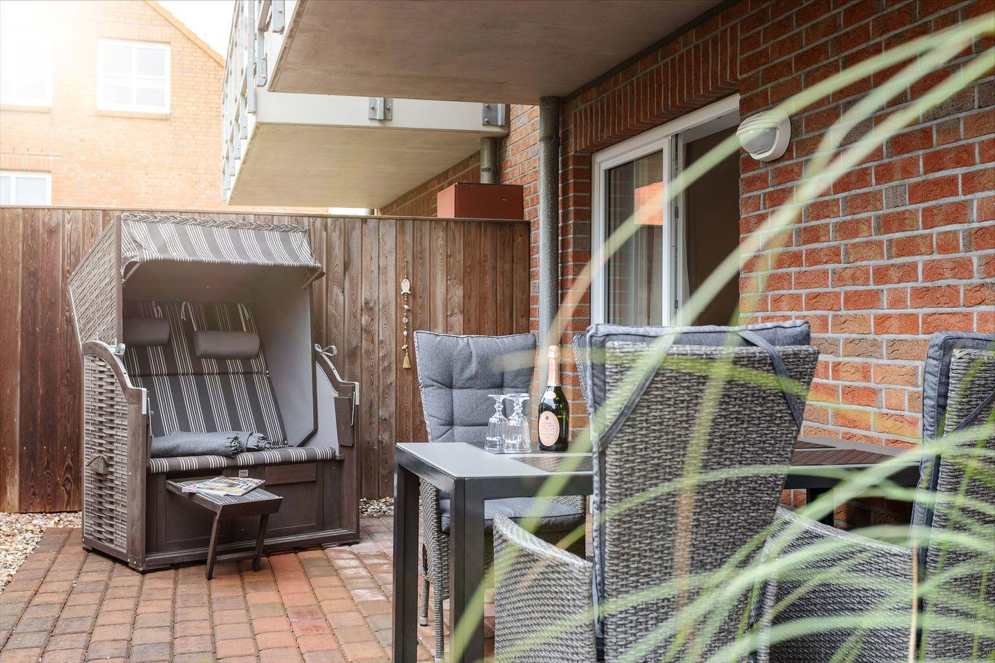 Herzlich Willkommen in der Ferienwohnung "Suutje Bude" in Büsum! Diese barrierearme Ferienwohnung bietet auf großzügigen 70m² Platz für bis zu 4 Personen. In der "Residenz Posthof'' gelegen, finden Sie hier den perfekten Rückzugsort für Ihren Urlaub in Büsum. Der Wohnbereich ist mit gemütlichen Polstermöbeln ausgestattet. Vom Wohnbereich haben Sie einen direkten Zugang zur möblierten Terrasse. An Schietwettertagen können Sie es sich vor dem LED-TV gemütlich machen und mit der Familie eine DVD schauen oder den Tag mit einem Spieleabend ausklingen lassen. In der offenen Küche finden Sie alles, was Sie für einen benötigen, um leckere Gerichte zu zaubern - perfekt für einen Kochabend mit der ganzen Familie! Für unsere kleinen Gäste steht ein Kinderhochstuhl zur Verfügung. Im Schlafzimmer erwartet Sie ein großes Doppelboxspringbett mit durchgehendem Topper (180 x 200) und ein Flachbild-TV. Für eine erholsame Nachtruhe ist das Schlafzimmer mit Verdunkelungsmöglichkeiten ausgestattet. Zwei weitere Schlafmöglichkeiten bietet das Doppel-Schrankbett im Wohnzimmer. Das moderne Bad verfügt über eine ebenerdige Dusche, Föhn & Handtuchtrockner. Unser Lieblingsort in der Ferienwohnung "Suutje Bude‘" ist der Strandkorb auf der Terrasse - abends können Sie hier herrlich entspannen und die Tage ausklingen lassen. Dank des Elektrogrills steht auch einem entspannten Grillabend nichts mehr im Wege - lassen Sie hier den Abend bei einem Glas Wein ausklingen. Ein kostenfreier Parkplatz steht Ihnen auf dem Gelände zur Verfügung. Mitgebrachte oder vor Ort geliehene Fahrräder können Sie im abschließbaren Schuppen unterstellen & Ihre E-Bikes dort für den nächsten Ausflug laden.