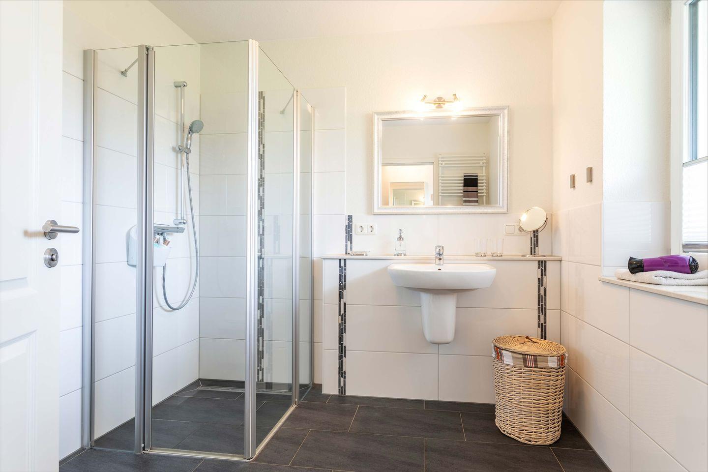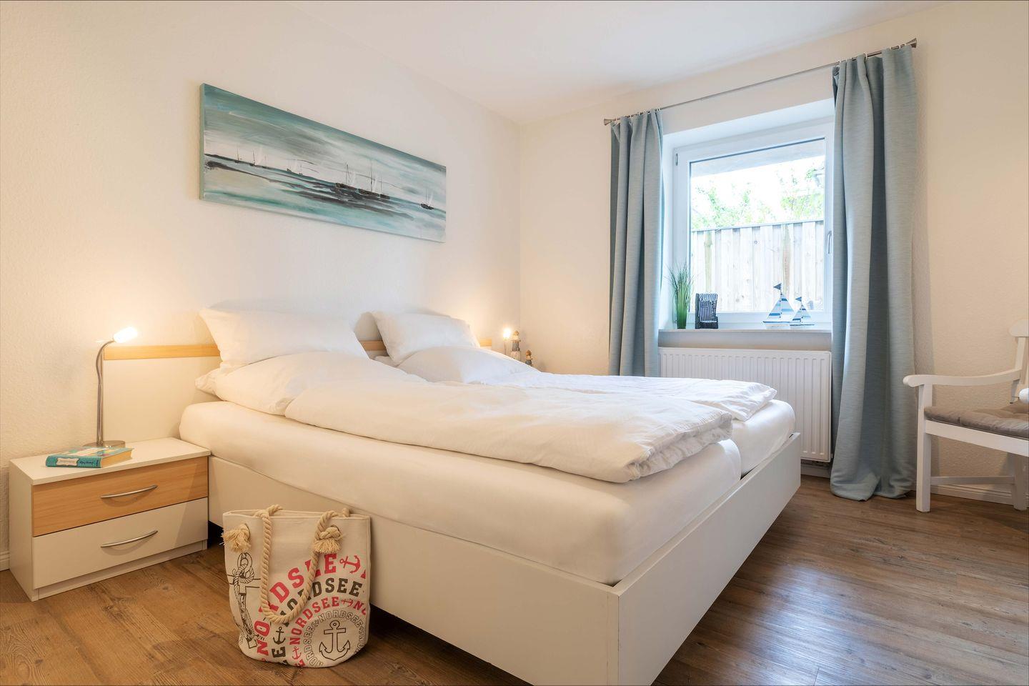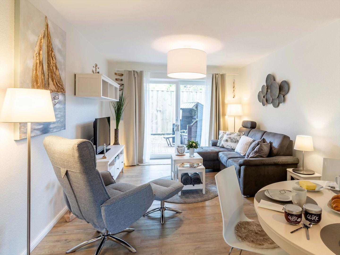 Herzlich Willkommen in der Ferienwohnung "Suutje Bude" in Büsum! Diese barrierearme Ferienwohnung bietet auf großzügigen 70m² Platz für bis zu 4 Personen. In der "Residenz Posthof'' gelegen, finden Sie hier den perfekten Rückzugsort für Ihren Urlaub in Büsum. Der Wohnbereich ist mit gemütlichen Polstermöbeln ausgestattet. Vom Wohnbereich haben Sie einen direkten Zugang zur möblierten Terrasse. An Schietwettertagen können Sie es sich vor dem LED-TV gemütlich machen und mit der Familie eine DVD schauen oder den Tag mit einem Spieleabend ausklingen lassen. In der offenen Küche finden Sie alles, was Sie für einen benötigen, um leckere Gerichte zu zaubern - perfekt für einen Kochabend mit der ganzen Familie! Für unsere kleinen Gäste steht ein Kinderhochstuhl zur Verfügung. Im Schlafzimmer erwartet Sie ein großes Doppelboxspringbett mit durchgehendem Topper (180 x 200) und ein Flachbild-TV. Für eine erholsame Nachtruhe ist das Schlafzimmer mit Verdunkelungsmöglichkeiten ausgestattet. Zwei weitere Schlafmöglichkeiten bietet das Doppel-Schrankbett im Wohnzimmer. Das moderne Bad verfügt über eine ebenerdige Dusche, Föhn & Handtuchtrockner. Unser Lieblingsort in der Ferienwohnung "Suutje Bude‘" ist der Strandkorb auf der Terrasse - abends können Sie hier herrlich entspannen und die Tage ausklingen lassen. Dank des Elektrogrills steht auch einem entspannten Grillabend nichts mehr im Wege - lassen Sie hier den Abend bei einem Glas Wein ausklingen. Ein kostenfreier Parkplatz steht Ihnen auf dem Gelände zur Verfügung. Mitgebrachte oder vor Ort geliehene Fahrräder können Sie im abschließbaren Schuppen unterstellen & Ihre E-Bikes dort für den nächsten Ausflug laden.