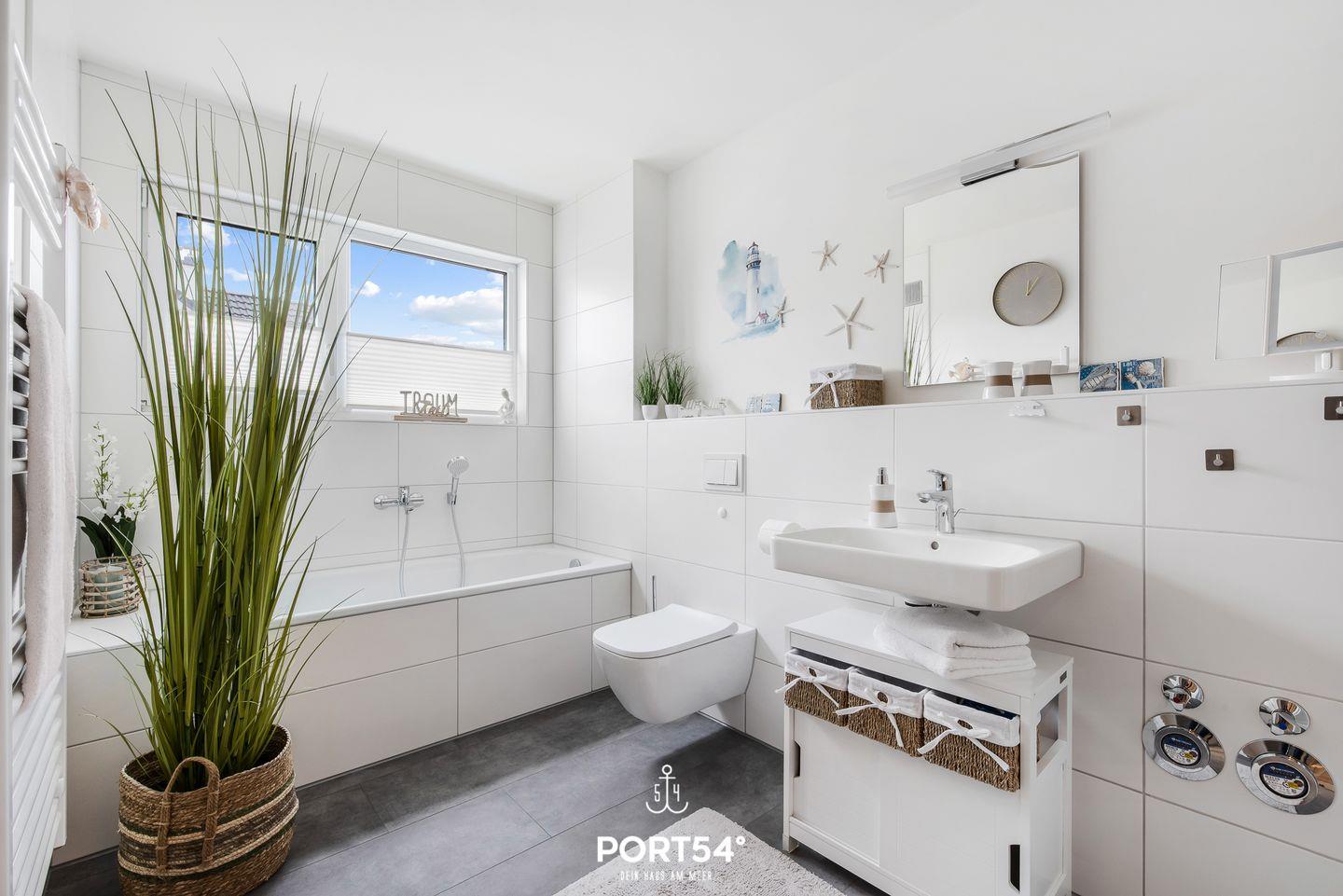 Das Badezimmer hat sowohl eine Dusche als auch eine Badewanne und ist darüber hinaus, als ein weiteres Highlight, mit einer Infrarotsauna ausgestattet.