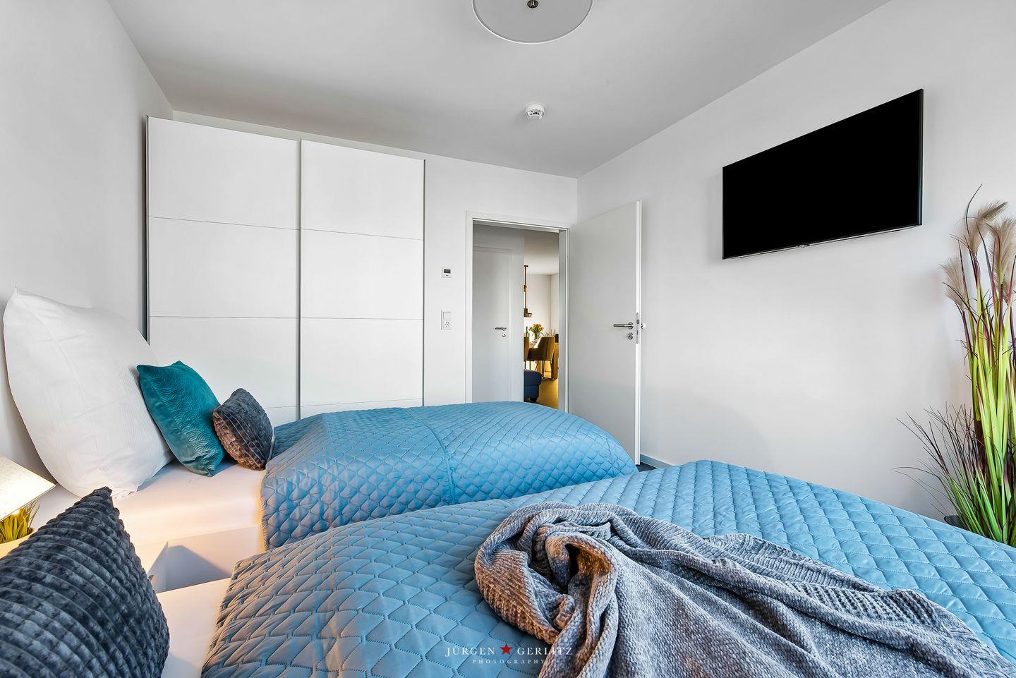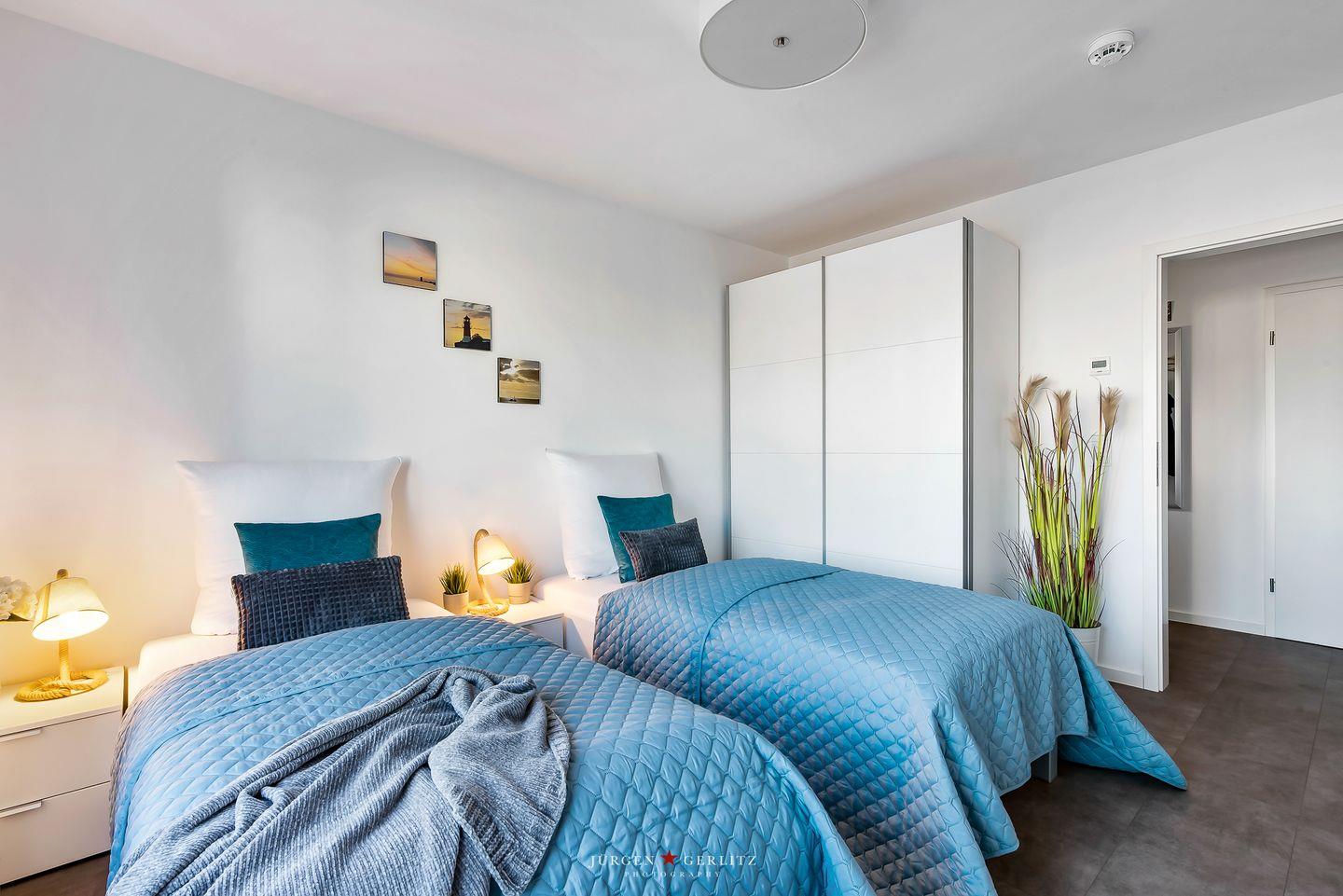 Die beiden Schlafzimmer sind gemütlich eingerichtet. Das eine Zimmer hat ein Doppelbett, das andere 2 Einzelbetten, die zusammengeschoben werden können.