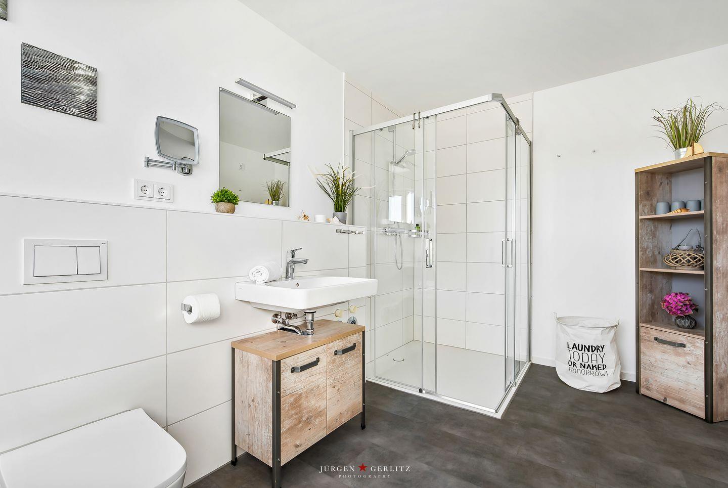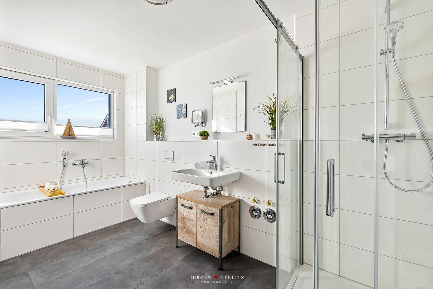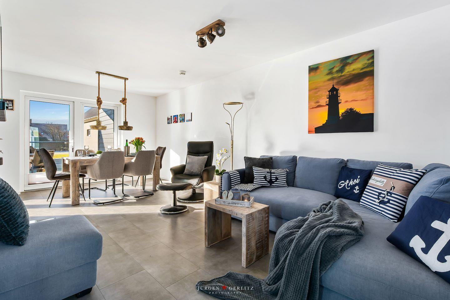 Die Ferienwohnung "Ankerplatz" mit 80 m² bietet viel Platz. Das Wohnzimmer mit Kamin und einem TV lädt nach einem Spaziergang an der frischen Nordseeluft zum Entspannen ein. Die Küche ist hochwertig und voll ausgestattet. Beide Schlafzimmer bieten Ihnen einen TV, eins verfügt über ein Doppelbett & das zweite über 2 Einzelbetten. Das moderne Badezimmer verfügt neben der großzügigen Dusche auch über eine Infrarotkabine.