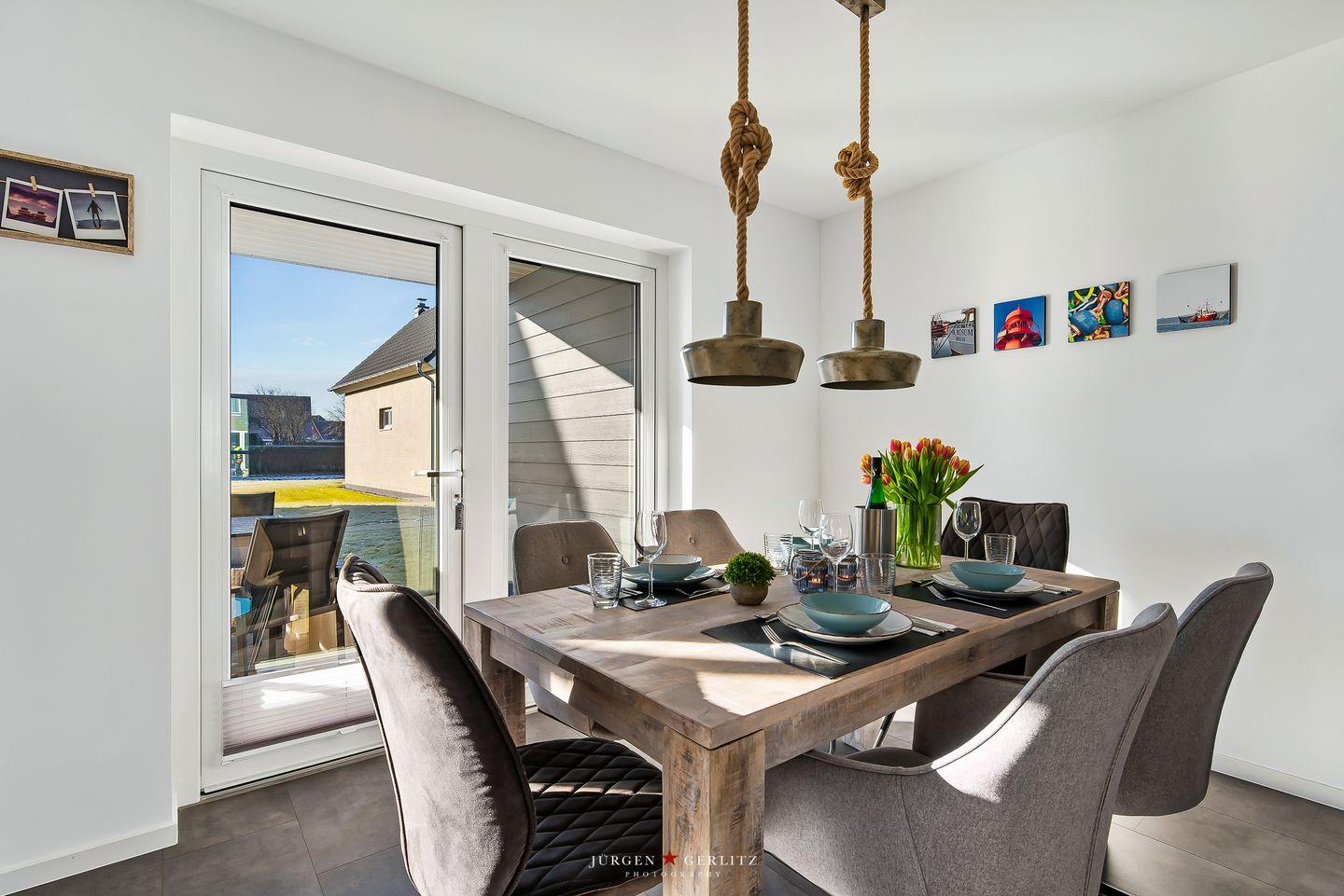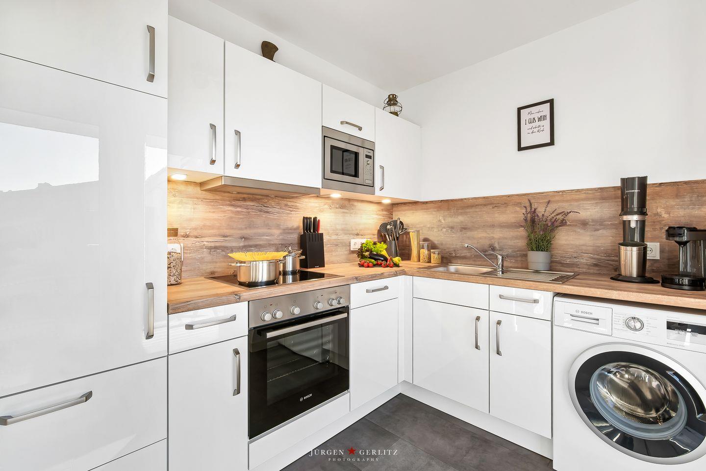 Die Ferienwohnung "Ankerplatz" bietet auf ca. 80m² Platz für bis zu 4 Personen (auf Anfrage können noch 2 Personen dazu gebucht werden). Die Wohnung verfügt über ein offenen Wohn-/Essbereich mit einem Schlafsofa und einem Kamin, vor dem Sie es sich an kalten Tagen gemütlich machen können. Die Küche ist modern und hochwertig. Sie ist ausgestattet mit Waschmaschine, Geschirrspüler, Switch-Kaffeemaschine, Sodastream, Wasserkocher, Toaster und Mikrowelle. In der Abstellkammer befindet sich zudem ein Staubsauger sowie ein Bügeleisen- und Brett.
