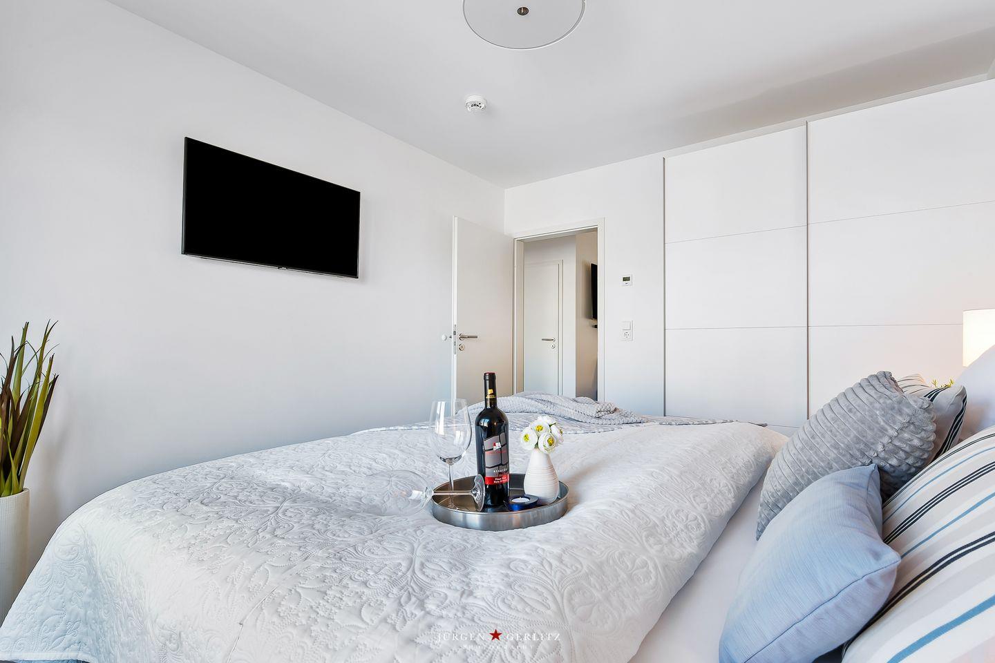 Außerdem befindet sich in beiden Schlafzimmern jeweils ein TV. Das Badezimmer ist mit Badewanne und Dusche ausgestattet. Für die kleinen Gäste ist ebenfalls gut gesorgt, denn es gibt einen Hochstuhl sowie ein Kleinkinderreisebett. Ihr geliebter Vierbeiner ist hier herzlich willkommen. Zur Wohnung gehört eine schöne Terrasse mit einem Elektrogrill, sodass Sie an lauen Sommerabenden ein geselliges Barbecue veranstalten können.