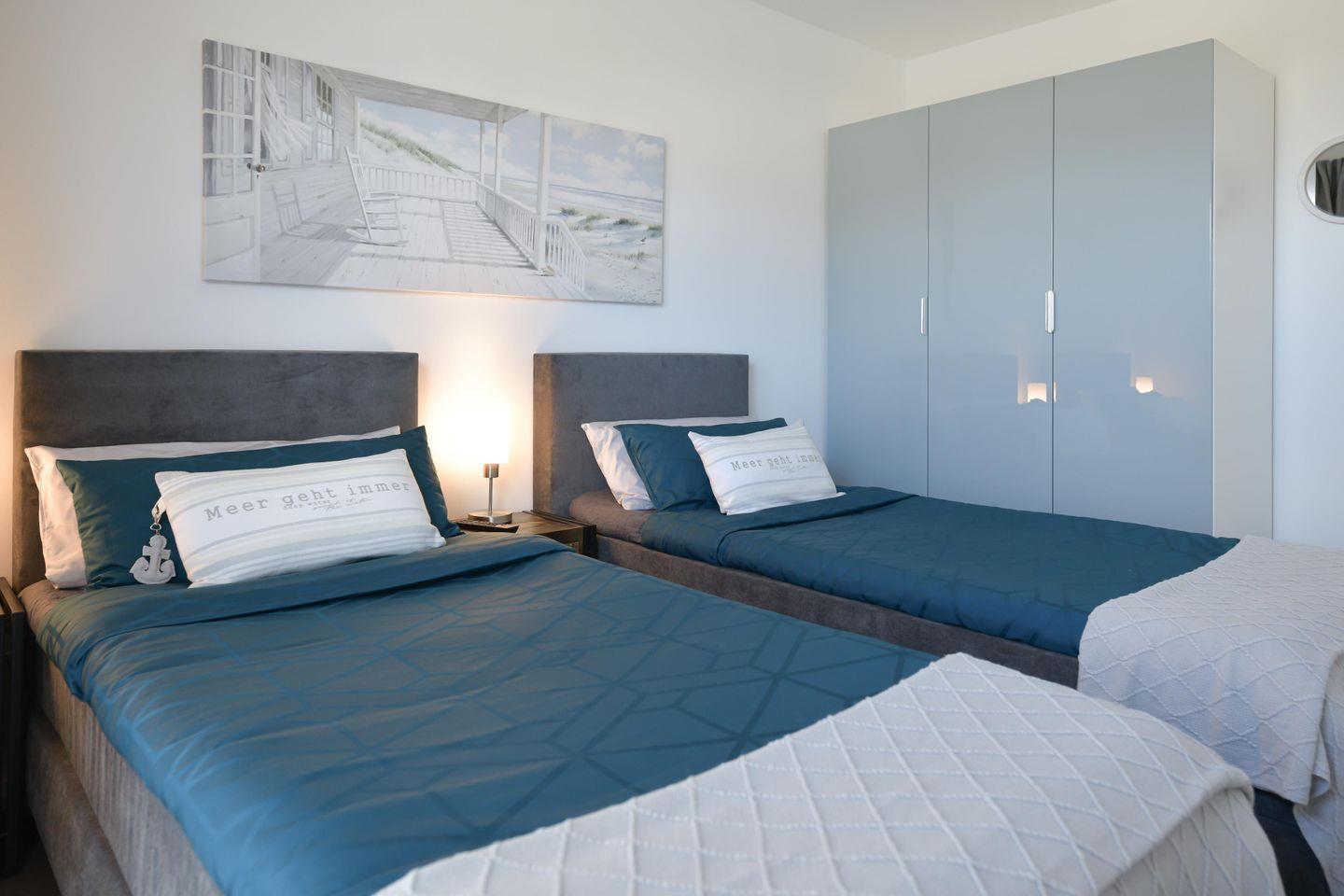 Die Ferienwohnung "Haukes Koje" mit 80m² bietet viel Platz verteilt auf 3 Zimmer. Die Wohnung besticht vor allem durch ihre Barrierefreiheit und ihre breite Türen. Auch Gäste, die Ihren Ruhestand an der frischen Seeluft auskosten wollen, werden sich in "Haukes Koje" bestens aufgehoben fühlen. Das Wohnzimmer mit Kaminofen und einem Flatscreen-TV lädt nach einem Spaziergang an der frischen Nordseeluft zum gemeinsamen Beisammensein ein. Die Küche ist hochwertig und voll ausgestattet. In den separaten Schlafzimmern gibt es in dem einen ein Doppelbett und in dem anderen 2 Einzelbetten. Beide Schlafzimmer sind zudem mit einem Flatscreen-TV ausgestattet. Das moderne Badezimmer verfügt neben der barrierefreien Dusche auch über eine Infrarotkabine. Die Türöffnung der Dusche hat die Maße 1,20 x 1,20 m. Für erholsame Urlaubstage und -nächte sind alle Zimmer mit Insektenschutzgittern ausgestattet. Alle Informationen über den Erhalt der Gästekarte erhalten Sie bei Buchung. Ein weiteres Highlight der Wohnung ist die Terrasse mit einem Holzkohlegrill und Terrassenmöbeln, auf der Sie die gesunde Nordseeluft genießen können. Ein PKW-Stellplatz steht Ihnen zur Verfügung. Mitgebrachte oder vor Ort ausgeliehene Fahrräder können im abschließbaren Fahrradschuppen direkt vor dem Haus untergestellt werden. Sollten Sie Ihren Nordseeurlaub mit der ganzen Familie und Freunden verbringen wollen, können wir Ihnen durch die Verwaltung mehrerer Objekte auch eine Symbiose aus 2 nebeneinander liegenden Ferienwohnungen ermöglichen.