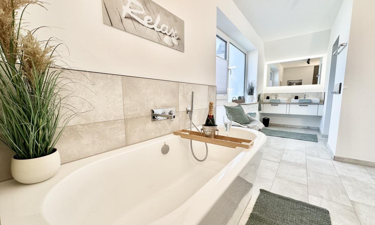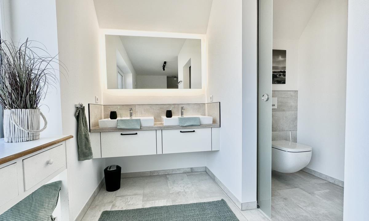 Im ersten Obergeschoss finden Sie zwei gemütliche Schlafzimmer mit jeweils einem Kingsize-Bett und Flachbild-TV´s. Alle Schlafzimmer verfügen über Verdunkelungsmöglichkeiten für erholsame Urlaubsnächte. Das Wellnessbadezimmer bietet neben einem Handtuchtrockner und einem Föhn eine Badewanne und eine ebenerdige Dusche.
