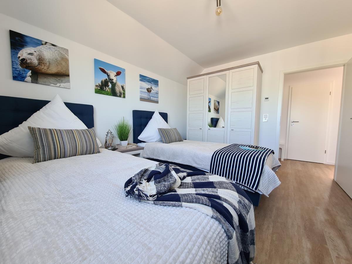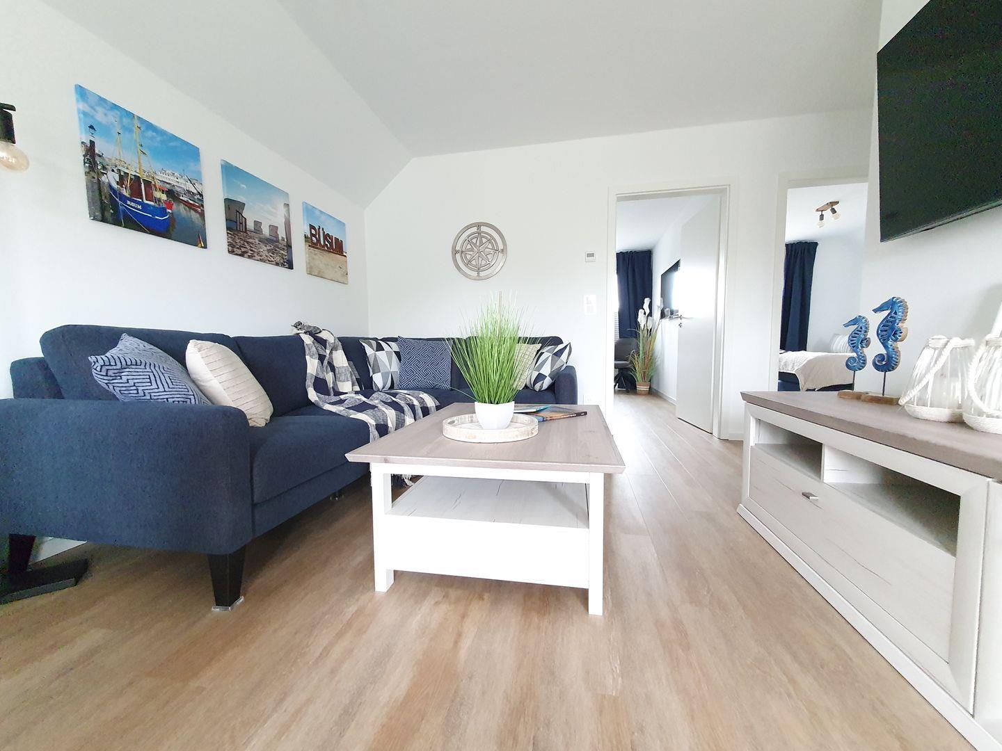 Die Ferienwohnung "Meerfreude“ im NordseeResort Büsum empfängt Gäste mit einem freundlichen, hellen, maritimen Design. Die sehr hochwertig ausgestattete Ferienwohnung im ersten Obergeschoss verfügt auf 80m² über einen großen offenen Wohn- und Essbereich mit angrenzender Küche, zwei Schlafzimmer und ein großzügiges Badezimmer mit Infrarotsauna. Große Flachbild-Fernseher sind in den Schlafzimmern und im Wohnzimmer vorhanden. Auf dem kuscheligen Sofa im Wohnzimmer, können Sie es sich für entspannte Filmeabende so richtig gemütlich machen und auf dem Smart-TV Ihre Lieblingsserie auf Magenta TV anschauen. Der Kamin sorgt für eine mollige Wärme und gemütliche Atmosphäre, gerade an den kälteren Tagen im Jahr. In der angrenzenden, offenen und vollausgestatteten Küche können alle zusammen kochen und die Ruhe des NordseeResorts genießen. Für die entspannte Nachtruhe verfügt die "Meerfreude“ über zwei Schlafzimmer, wovon eins mit einem Doppelboxspringbett (180x200cm) und das andere mit zwei Einzelboxspringbetten (je 90x200cm) ausgestattet ist. Die beiden Einzelbetten sind zusammenschiebbar, somit können Sie auch perfekt mit 2 Paaren anreisen. Im Badezimmer befindet sich neben einer ebenerdigen Dusche auch eine Badewanne und eine Infrarot-Sauna. Der große Balkon mit gemütlichen Gartenmöbeln bietet viel Privatsphäre und Ruhe, mit Blick über einen kleinen Bach auf schöne, grüne Gärten und ein ruhiges Wohngebiet. Die Sonne können Sie dort von morgens bis abends genießen. Auch einem gemütlichen Grillabend steht dank eines eigenen Weber Elektro-Grills nichts im Wege. Vor der "Meerfreude“ steht Ihnen ein eigener, kostenfreier Parkplatz für einen PKW zur Verfügung. Auch mitgebrachte Fahrräder können im abschließbaren Schuppen untergestellt und E-Bikes aufgeladen werden. Für unsere kleinen Gäste stehen ein Hochstuhl und ein Kinderreisebett zur Verfügung. Sollten Sie Ihren Nordseeurlaub mit der ganzen Familie und Freunden verbringen wollen, können wir Ihnen durch die Verwaltung mehrerer Objekte auch eine Symbiose aus zwei nebeneinander liegenden Ferienunterkünften ermöglichen. Ihre kleinen Vierbeine sind gerne willkommen.