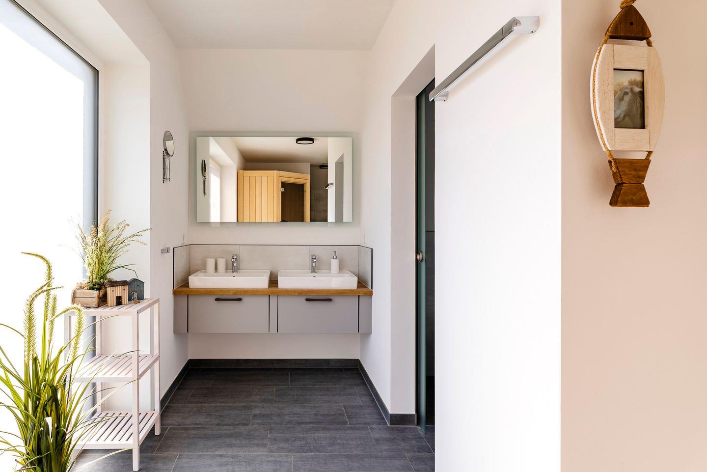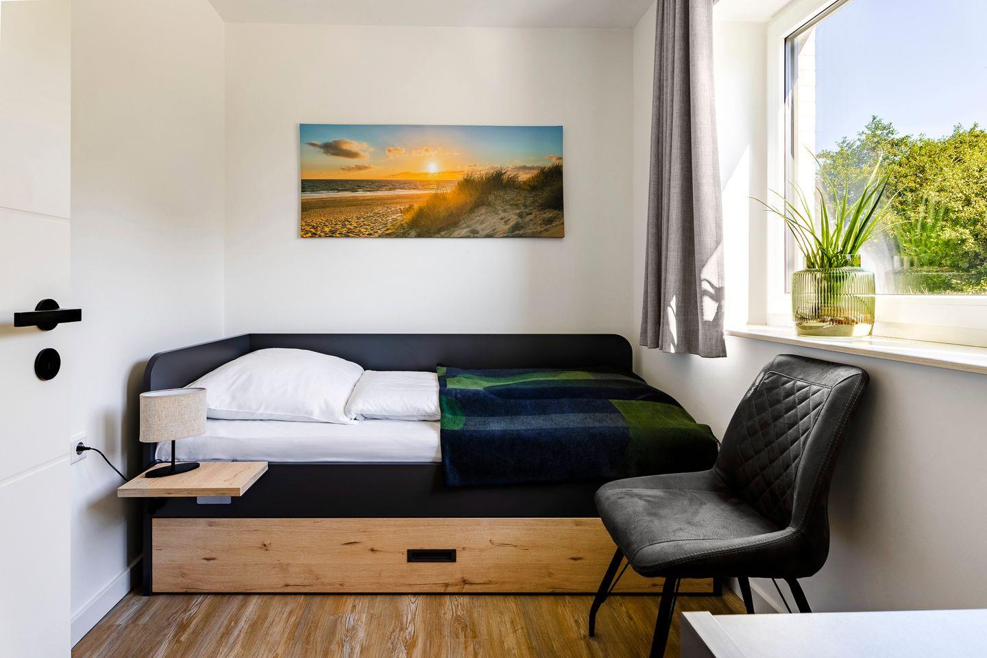 Luxus Nordseeurlaub direkt hinter dem Deich? Das und vieles mehr bietet das Ferienhaus "Haus Berg-Ahorn" für bis zu 6 Personen. Über zwei Etagen bietet das Reihenendhaus auf über 100m² neben drei Schlafzimmern auch zwei Badezimmer, einen großen, lichtdurchfluteten Wohn- und Essbereich mit offener Küche, eine Terrasse und eine Loggia im Obergeschoss. Das im Erdgeschoss gelegene Schlafzimmer verfügt über ein Ausziehbett mit zwei Schlafmöglichkeiten (je 80x200cm). Die im Obergeschoss gelegenen Schlafzimmer bieten zwei große Doppelbetten (160x200cm und 180x200cm). Alle drei Schlafzimmer sind mit einem Flachbild-TV ausgestattet. Des Weiteren besteht die Möglichkeit, diese Räumlichkeiten zu verdunkeln, so dass Ihrer Nachtruhe nichts im Wege steht. Das Duschbad im Obergeschoss überzeugt durch eine große Dusche und ein separates WC sowie eine Finnische Sauna. Hier kann nach langen Spaziergängen herrlich entspannt werden. Das Gäste Bad im Erdgeschoss bietet Ihnen ein zusätzliches WC und Waschbecken.