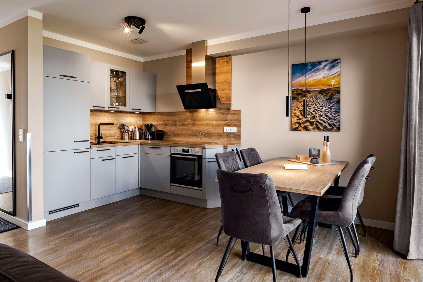 Luxus Nordseeurlaub direkt hinter dem Deich? Das und vieles mehr bietet das Ferienhaus "Haus Traubeneiche" für bis zu 6 Personen. Über zwei Etagen bietet das Ferienhaus auf etwa 120m² neben drei Schlafzimmern auch zwei Badezimmer, einen großen, lichtdurchfluteten Wohn- und Essbereich mit offener Küche, eine Terrasse und eine Loggia im Obergeschoss. Das im Erdgeschoss gelegene Schlafzimmer verfügt über ein Doppelbett (180x200cm), ebenso die die im Obergeschoss gelegenen Schlafzimmer (160x200cm und 180x200cm). Alle drei Schlafzimmer sind mit einem Flachbild-TV ausgestattet, sowie vollständig verdunkelbar, sodass der Nachtruhe nichts im Wege steht. Das Duschbad im Obergeschoss überzeugt durch eine finnische Sauna, eine Badewanne sowie eine große Dusche und ein separates WC. In der finnischen Sauna kann nach langen Spaziergängen herrlich entspannt werden. Im Badezimmer im Erdgeschoss bietet eine zweite Dusche eine durchdachte räumliche Trennung zum unteren Schlafzimmer. Die in Süd-West-Ausrichtung ausgelegte vollmöblierte Terrasse, sowie die mit zwei Stühlen und einem Tisch ausgestattete Loggia im ersten Obergeschoss bieten zu fast jeder Tageszeit den perfekten Ort für entspannte Sonnenstunden. In der Abendsonne lassen sich perfekte Grillabende am Elektrogrill verbringen. Vor dem Haus steht ein kostenfreier, eigener Parkplatz und ein Fahrradschuppen zur Verfügung. Weitere PKW können an der Straße in Parkbuchten abgestellt werden. Ab Januar 2024 verfügt Ihr Parkplatz über eine E-Ladesäule, an welcher Sie Ihren PKW kostenpflichtig laden können.
