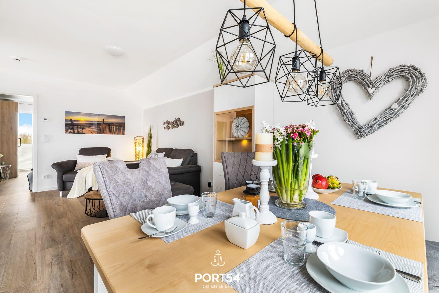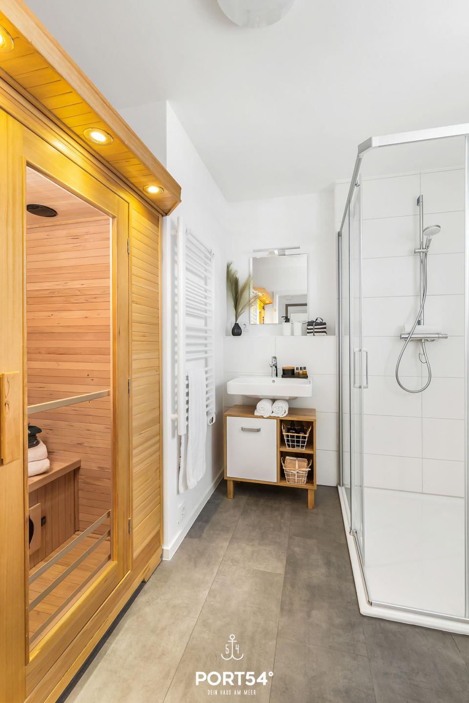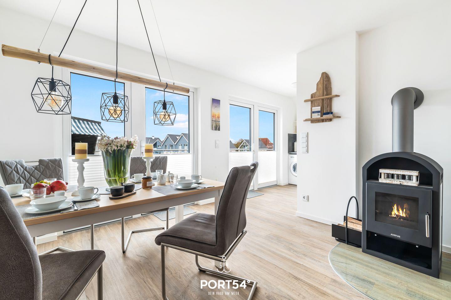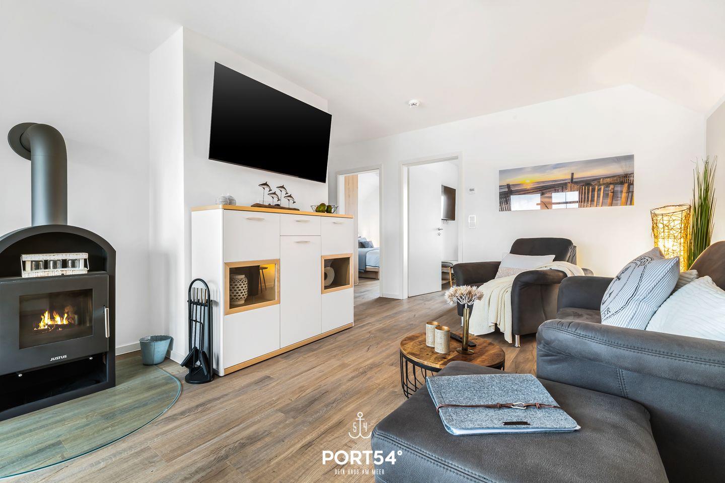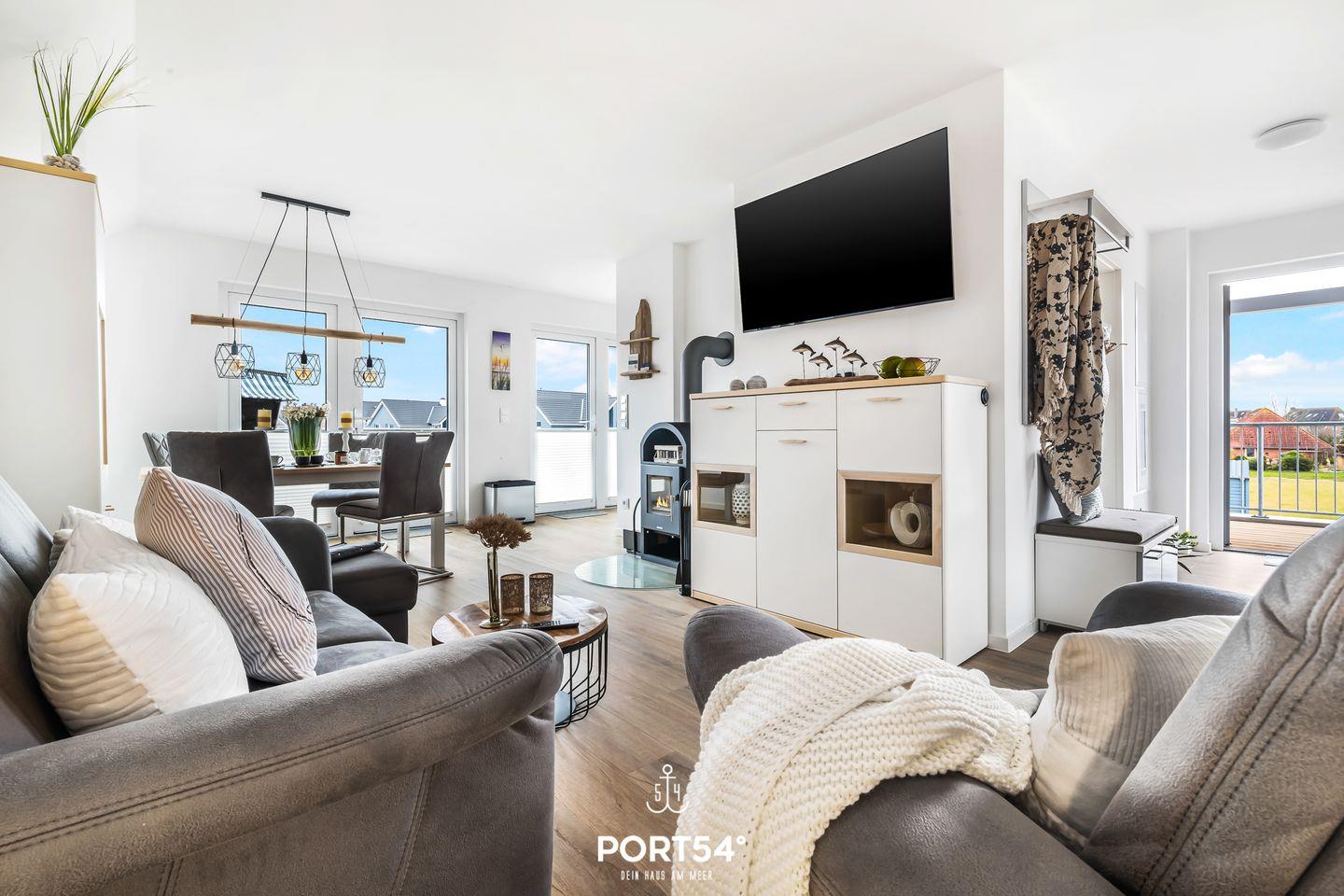 Verbringen Sie Ihren Nordseeurlaub in der exklusiven, modernen Ferienwohnung "SaMi". Ihr modernes Zuhause auf Zeit, mit eigenem PKW-Stellplatz vor dem Haus, erwartet Sie im ersten Obergeschoss auf ca. 80m² mit einer hochwertigen Ausstattung und ästhetischem Raumkonzept. Im Wohnzimmer befindet sich eine modernen Sofagarnitur zum Relaxen oder Fernsehschauen auf dem Flachbild-TV. Auf dem TV haben Sie auch Zugriff auf Netflix - Ihre Urlaubsabende können Sie also entspannt auf dem Sofa ausklingen, während Ihre Lieblingsserie läuft. Der Kamin im Wohnzimmer spendet im Winter mollige Wärme. Die offene Küche ist hochwertig ausgestattet, sodass Ihnen neben der Nespresso- und der Filterkaffeemaschine auch ein Wasserkocher, Spülmaschine, Backofen, Mikrowelle und ein Kühlschrank zur Verfügung stehen. Zwei Schlafzimmer sorgen mit einem Doppelbett, sowie zwei Einzelbetten, für erholsame Nächte. Darüber hinaus befinden sich in beiden Schlafzimmern zusätzliche Flachbild-TV's. Das geräumige Badezimmer bietet eine ebenerdige Dusche, einen Föhn und einen Handtuchtrockner. In der Infrarot-Sauna können Sie sich nach einem ausgiebigen Spaziergang entspannen. Für unsere kleinen Gäste steht ein Kinderhochstuhl zur Verfügung. Auf dem geräumigen Balkon können Sie die Sonne und die Nordseeluft genießen. Packen Sie den großen Picknickkorb mit Leckereien und starten Sie Ihren Ausflug zur Familienlagune Perlebucht. Hier werden unsere Kleinen überrascht mit tollen Spielgeräten, Klettergerüsten, Schaukeln, Hängematten und viel Platz zum Buddeln. Auch für Wassersportler wird einiges geboten. So können Sie in der Wassersportschule das Surfen und Kitesurfen erlernen. Ihre mitgebrachten oder ausgeliehenen Fahrräder, sowie einen Kinderwagen, können Sie im abschließbaren Fahrradschuppen direkt vor dem Haus unterstellen.