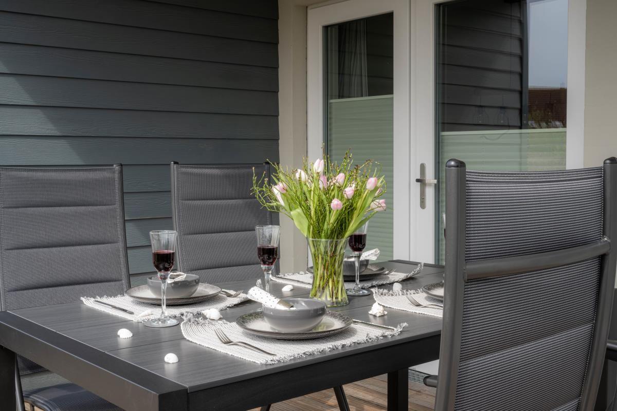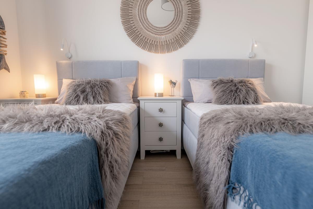 Es erwarten Sie auf knapp 80m² offene, lichtdurchflutete Räumlichkeiten mit einer geschmackvollen Einrichtung. Von der voll ausgestatteten Küche mit Essbereich gelangen Sie auf die Terrasse, hier können Sie die Sonnenaufgänge genießen. Im Wohnzimmer befindet sich ein Kamin & ein gemütliches Sofa. In einem der beiden Schlafzimmern finden Sie ein Doppelbett & im anderen 2 Einzelbetten vor. Das Badezimmer verfügt über eine ebenerdige Dusche, eine Badewanne & eine Infrarot-Sauna.