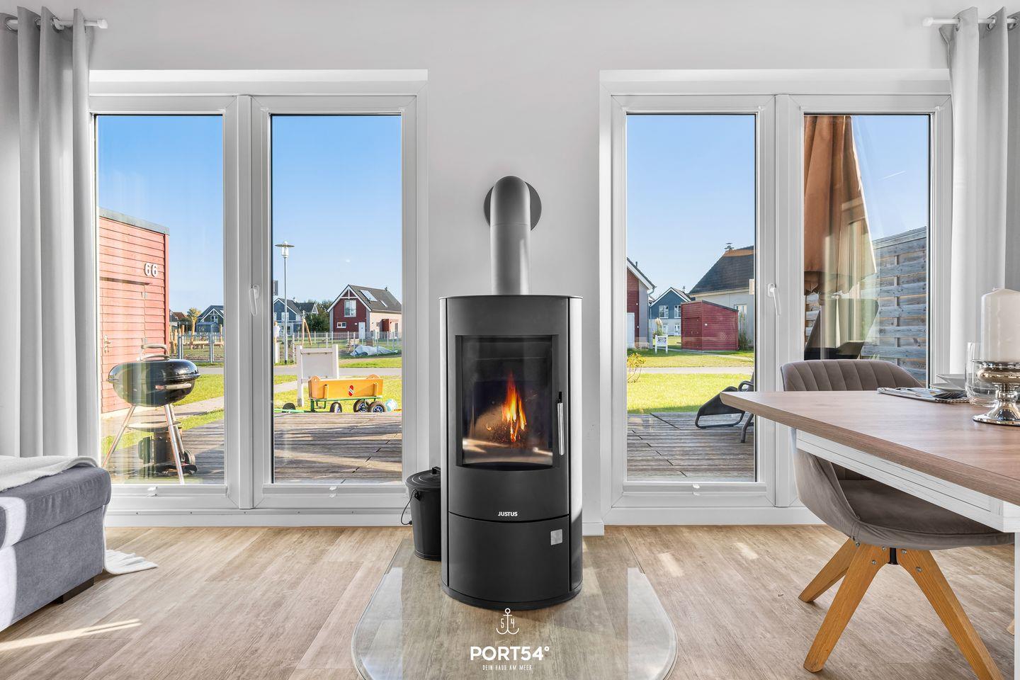 Der Wohnraum mit offener Küche und Esstisch für 6 Personen lässt keine Wünsche offen. Ein gemütliches Sofa und Lounge-Sessel laden zum Entspannen nach einem anstrengenden Strandtag ein. Falls der Regen zuschlägt und die Temperaturen die Lust auf Außenaktivitäten auf Eis legt, wird der Kamin im Wohnzimmer, zahlreiche Gesellschaftsspiele und ein moderner Flatscreen-TV die Stimmung und die Temperaturen heben.