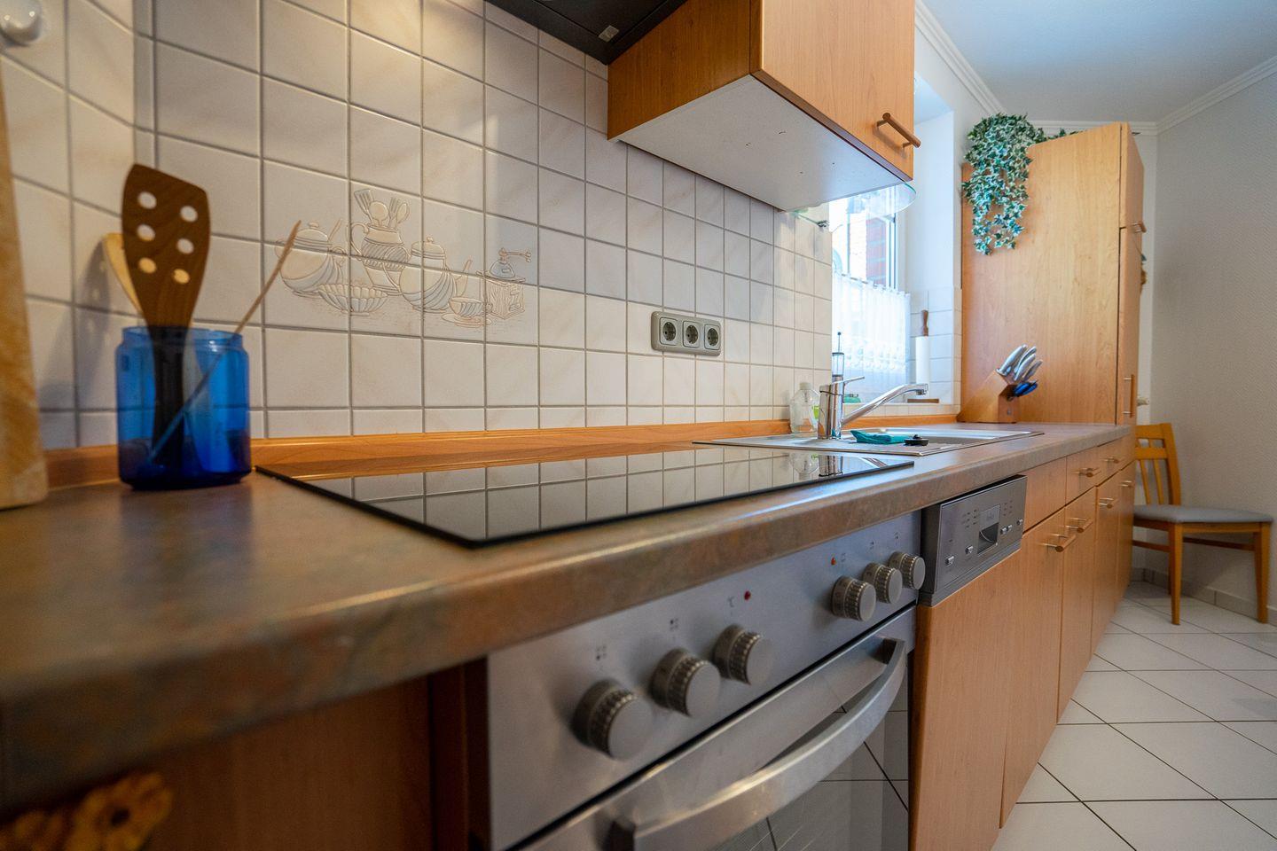 Die voll ausgestattete Küche bietet mit Backofen, Gefrierschrank und Geschirrspüler alles, was das Herz begehrt.