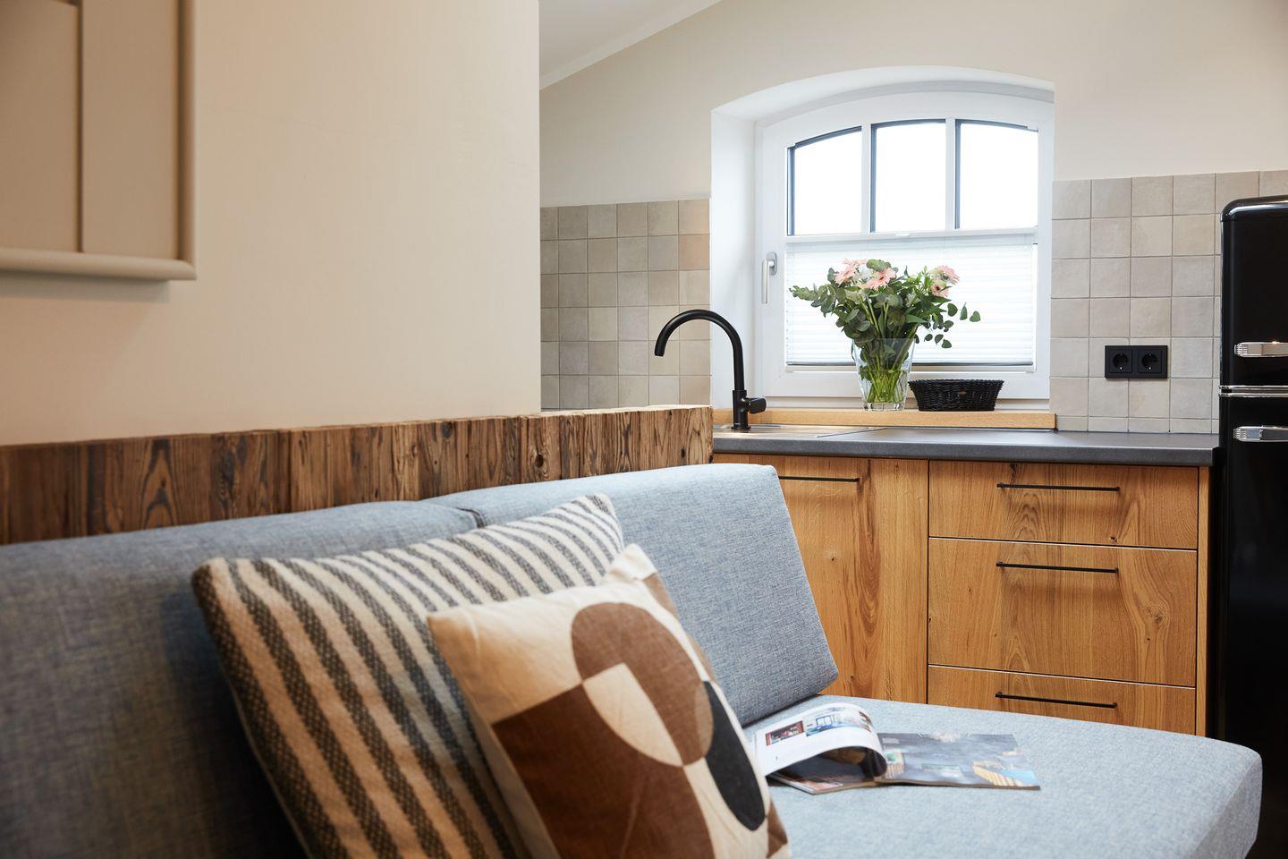 Auf rund 76 Quadratmetern finden vier Gäste Ihr kleines Urlaubsrefugium mit einer modernen und hochwertigen Ausstattung. Genießen Sie das entspannte Ambiente im lässigen Industrial Style, das gleichzeitig jede Menge Cozyness versprüht. Zusätzlich sorgen schallisolierte 3-fach verglaste Fenster und eine Fußbodenheizung für maximale Behaglichkeit.