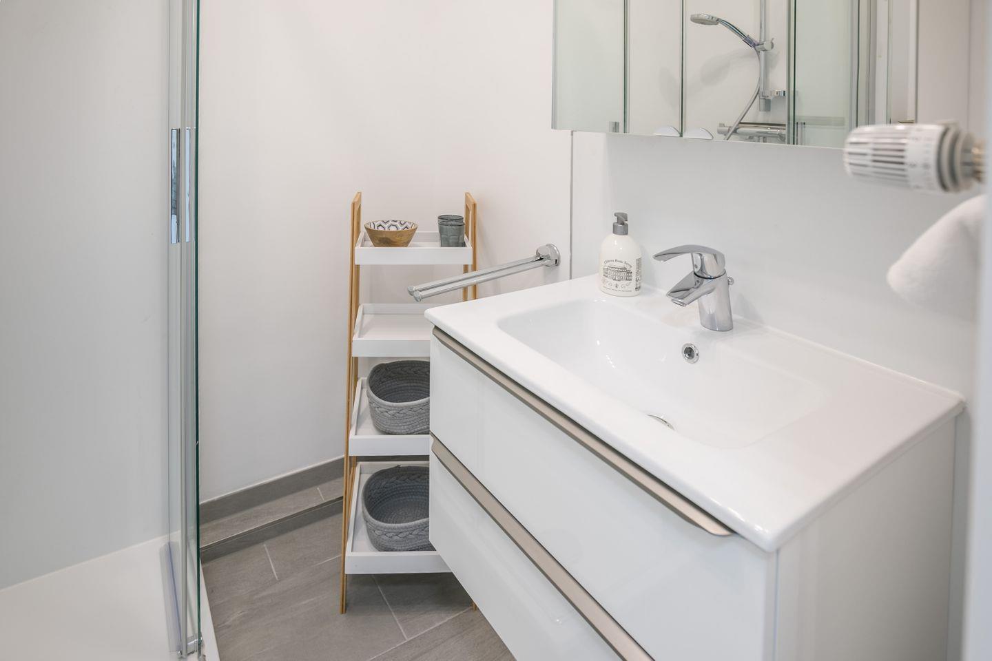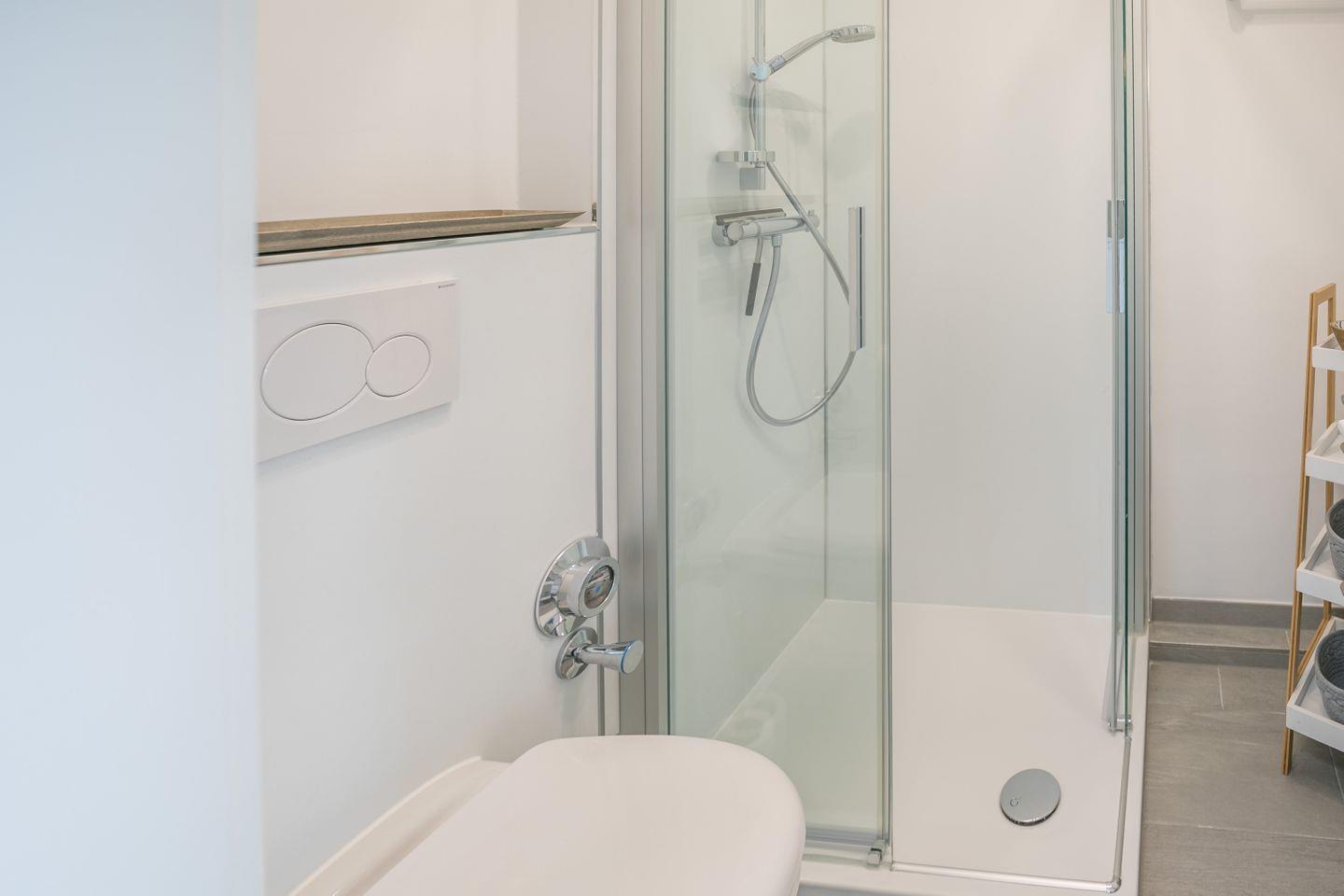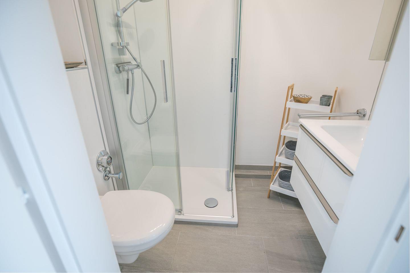Duschkabine, WC, Waschbecken, Unterschrank, Spiegel, Haartrockner, Abluft
