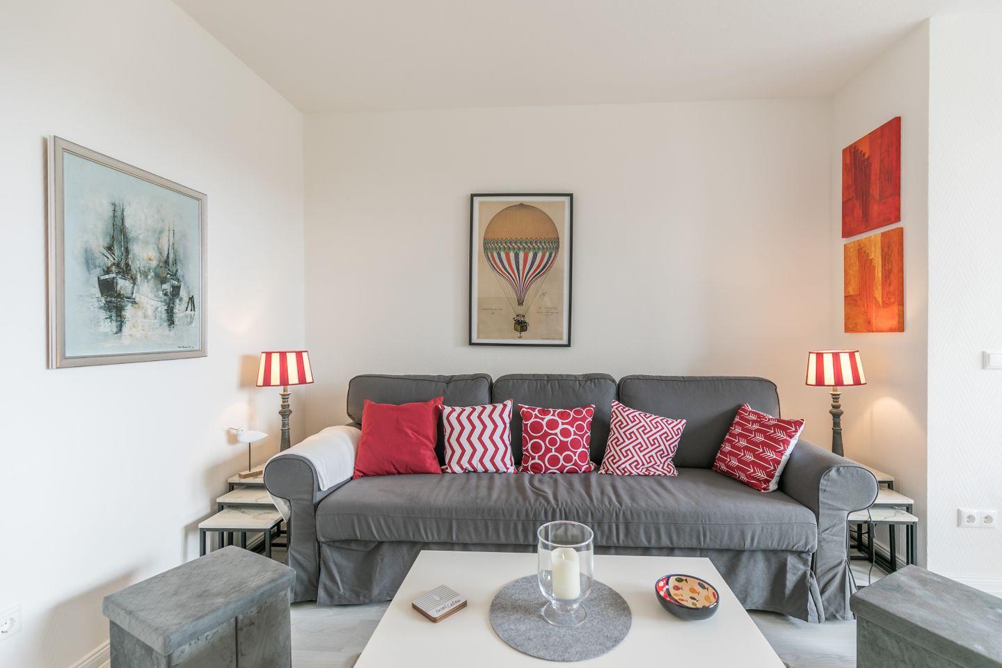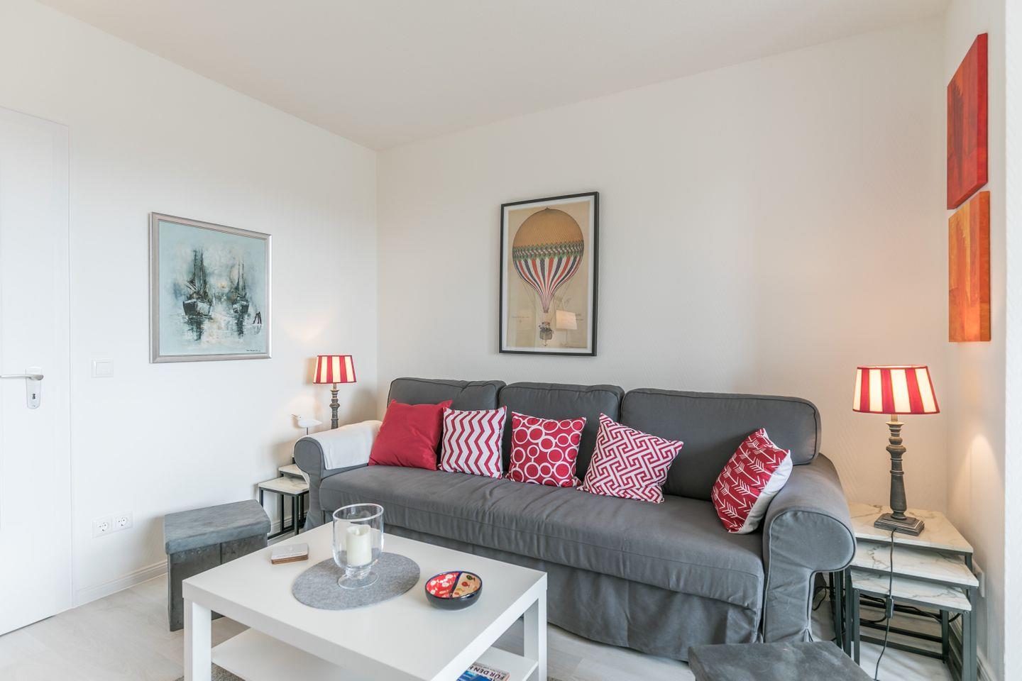 Das Wohnzimmer empfängt Sie mit einem gemütlichen Sofa mit Schlaffunktion sowie einer Ess-Ecke direkt am großen Fenster. Bei schönem Wetter lockt der kleine möblierte Balkon darauf zu verweilen.
