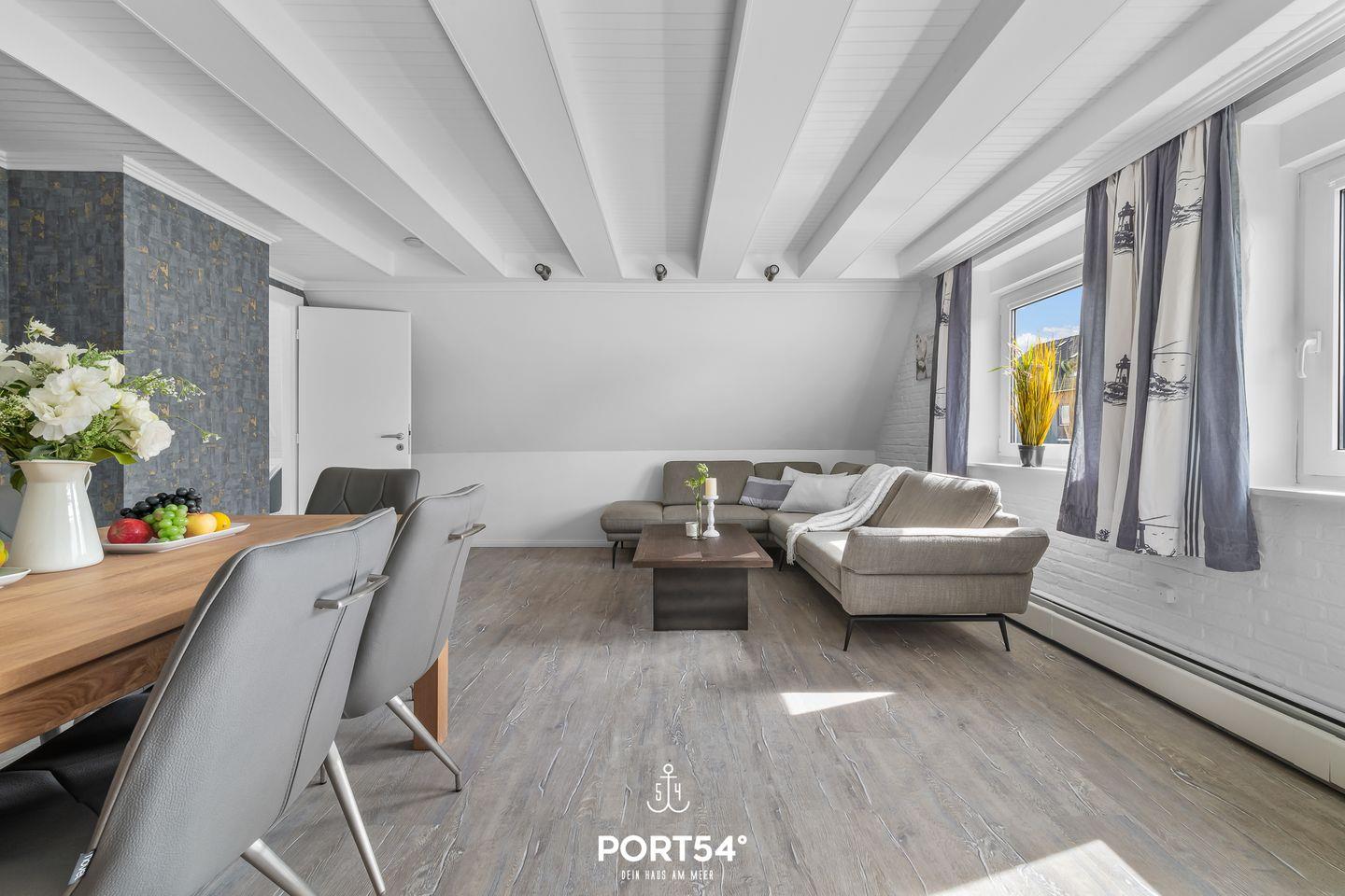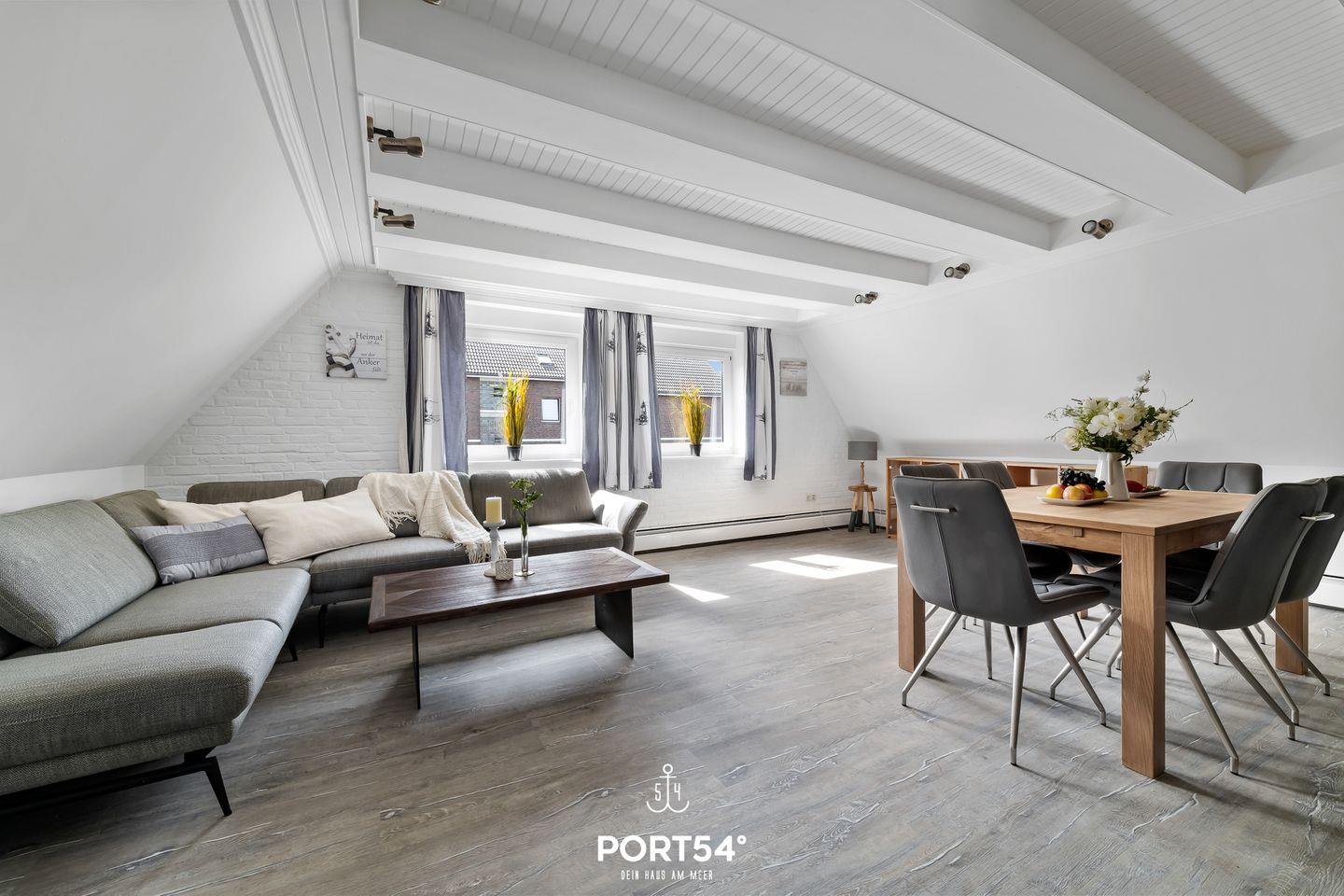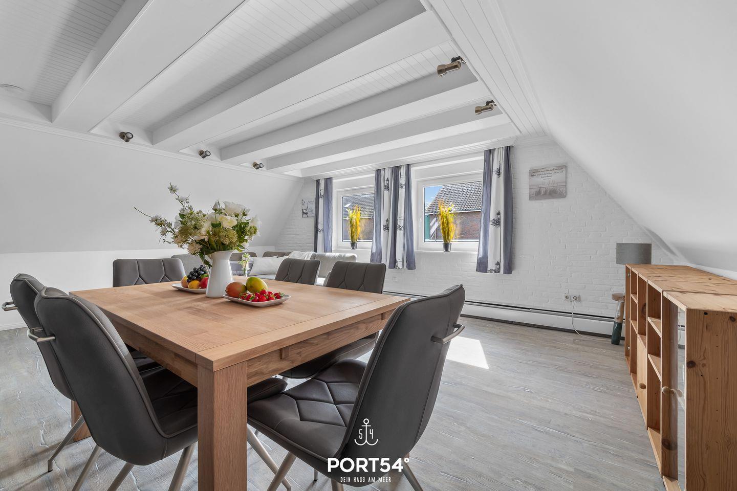 Die Strandnah gelegene Ferienwohnung bietet auf 82 m² einen offenen Wohn- und Essbereich mit Küche, zwei Schlafzimmer und ein Badezimmer. Eines der Schlafzimmer ist mit einem Doppelbett ausgestattet. Im Dachgeschoss stehen zwei einfache Einzelbetten zu Verfügung. Das Badezimmer verfügt über einen Föhn und eine Dusche. Ein Außenstellplatz am Haus ist vorhanden und Fahrräder können in einem gemeinschaftlichen Werkraum untergestellt werden.