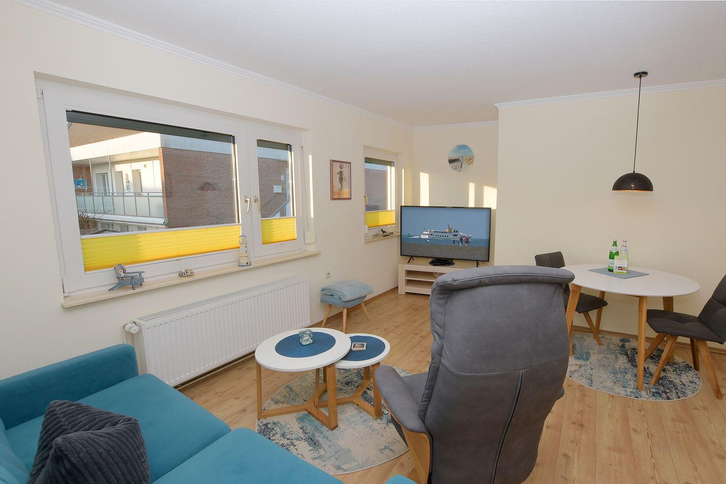Die offen gestaltete Ferienwohnung verfügt über zwei separate Schlafzimmer und einen großzügigen Wohnbereich, der mit einem bequemen Sofa, Sesseln, Esstisch sowie zwei Fernsehern für ausreichend Komfort sorgt.