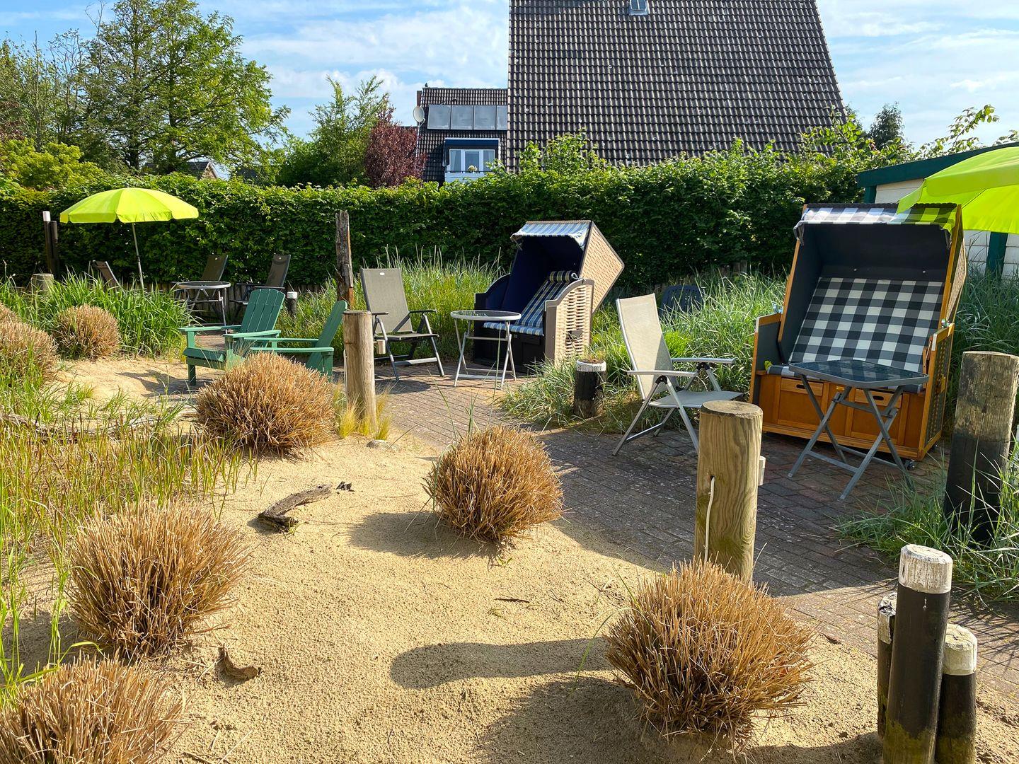 Auf dem Grundstück lädt ein ansprechender Gemeinschaftsgarten zur Erholung im Freien ein. Ein Strandkorb im Außenbereich bietet die Möglichkeit, die Sonne und das Nordseeklima entspannt zu genießen.