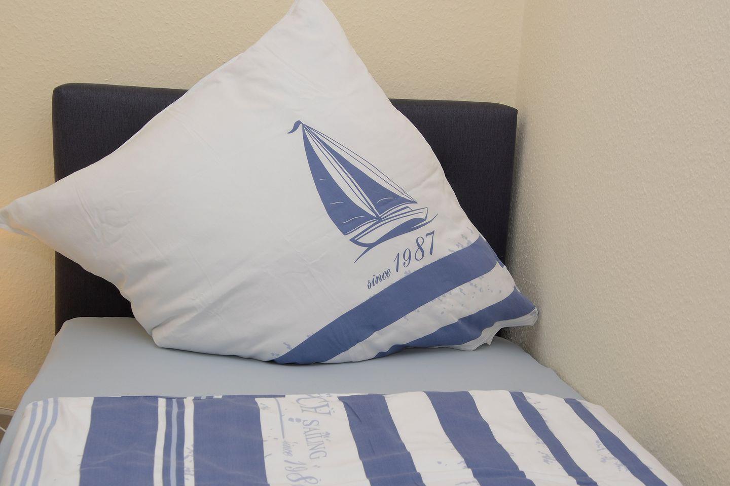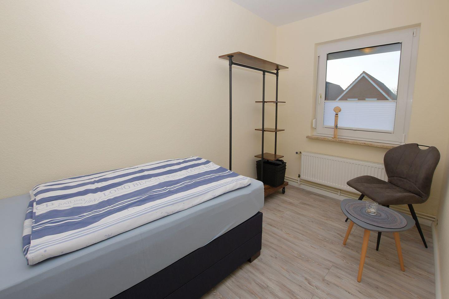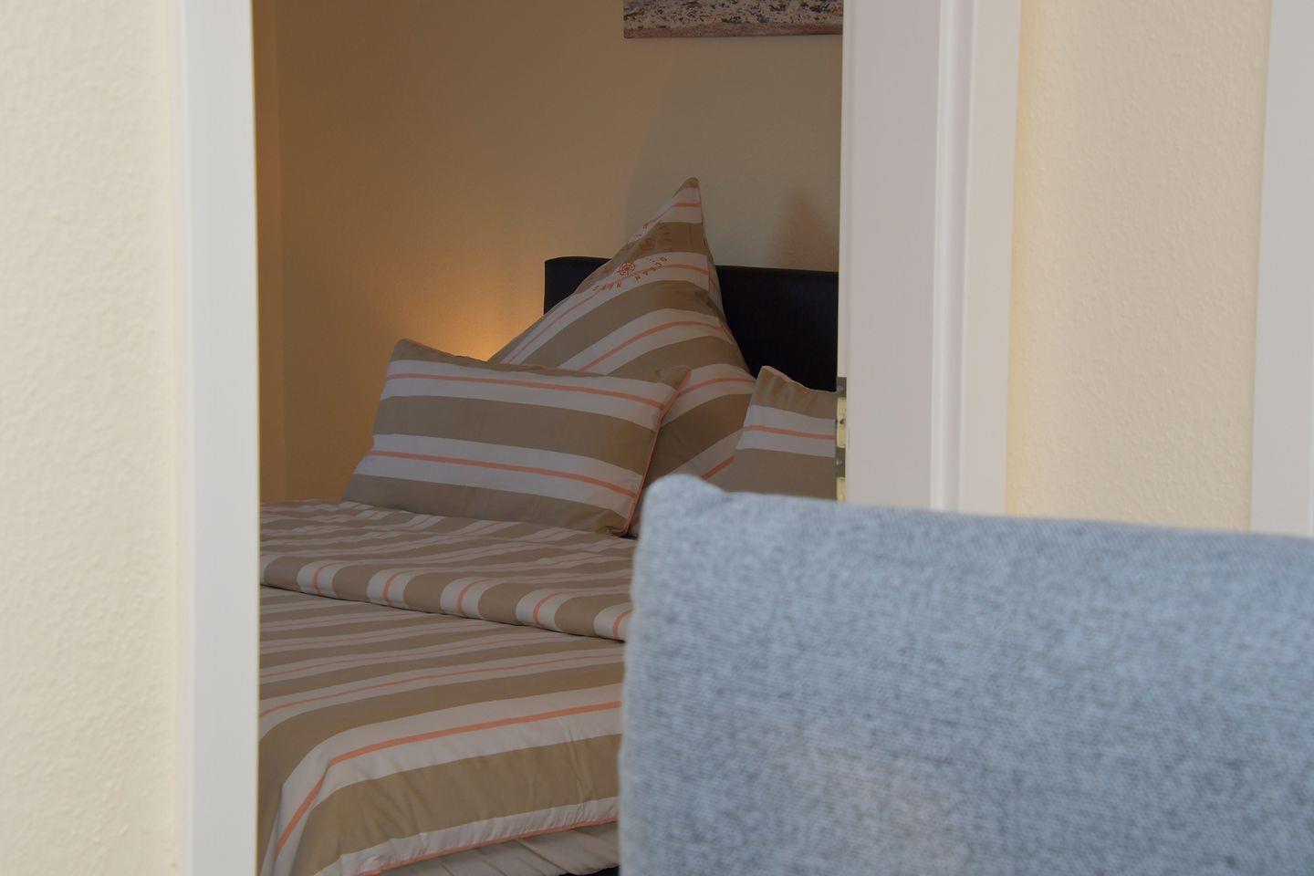 Die Ferienwohnung im 1. Obergeschoss eignet sich aufgrund ihrer Ausstattung und Größe ideal für Familien oder kleine Gruppen von bis zu drei Personen. Zwei separate Schlafzimmer bieten insgesamt drei Schlafmöglichkeiten und sorgen so für erholsamen Schlaf und Privatsphäre während Ihres Aufenthaltes. Das großzügig geschnittene Wohnzimmer lädt mit einem bequemen Sofa und einem Sessel zum Entspannen ein. Ein moderner TV, Radio und WLAN-Anschluss bieten Unterhaltung und ermöglichen es Ihnen, auch im Urlaub bestens vernetzt zu bleiben.