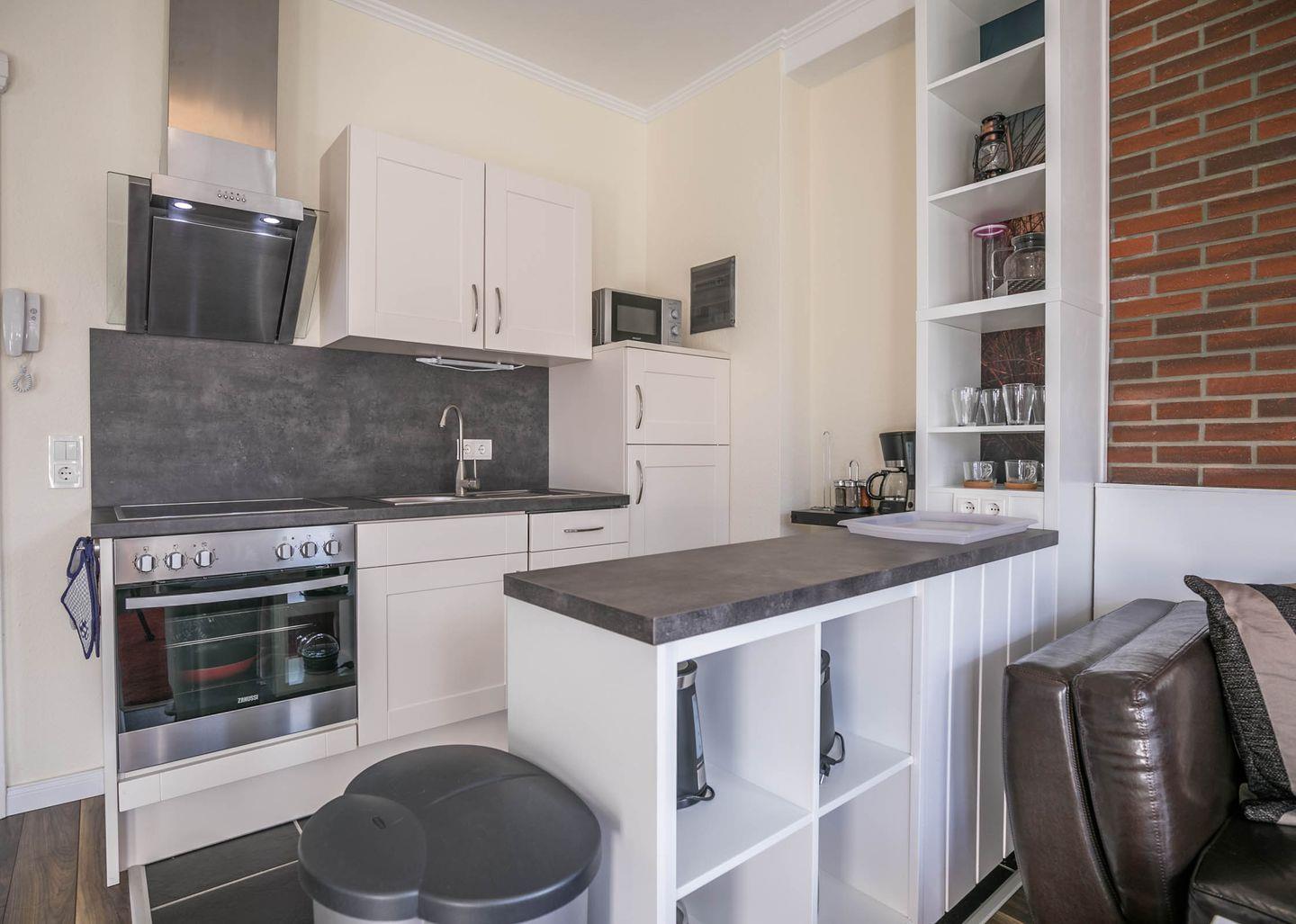 Küchenzeile: Cerankochfeld, Kühlschrank, Filterkaffee, Wasserkocher, Toaster, Eierkocher