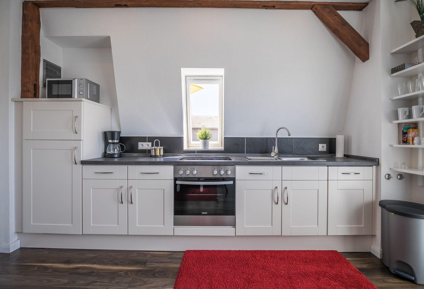Küchenzeile: Cerankochfeld, Kühlschrank, Filterkaffee, Wasserkocher, Toaster, Eierkocher