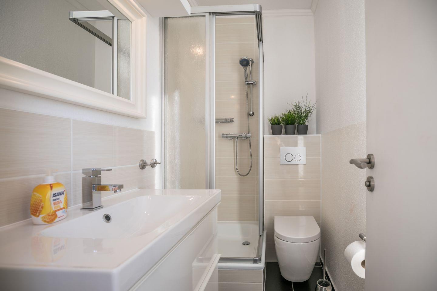 Sanitär: 2 Tageslicht - Duschbäder (1x Regendusche), Haar-Föhn, Kosmetikspiegel