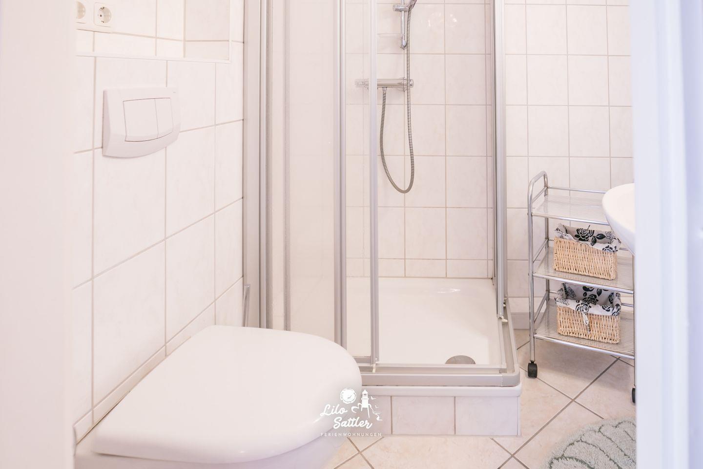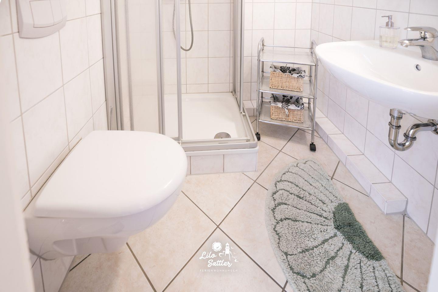 Dusche, Waschbecken, Toilette, Spiegel, Regal, Lüfter
