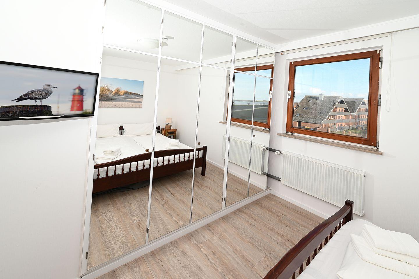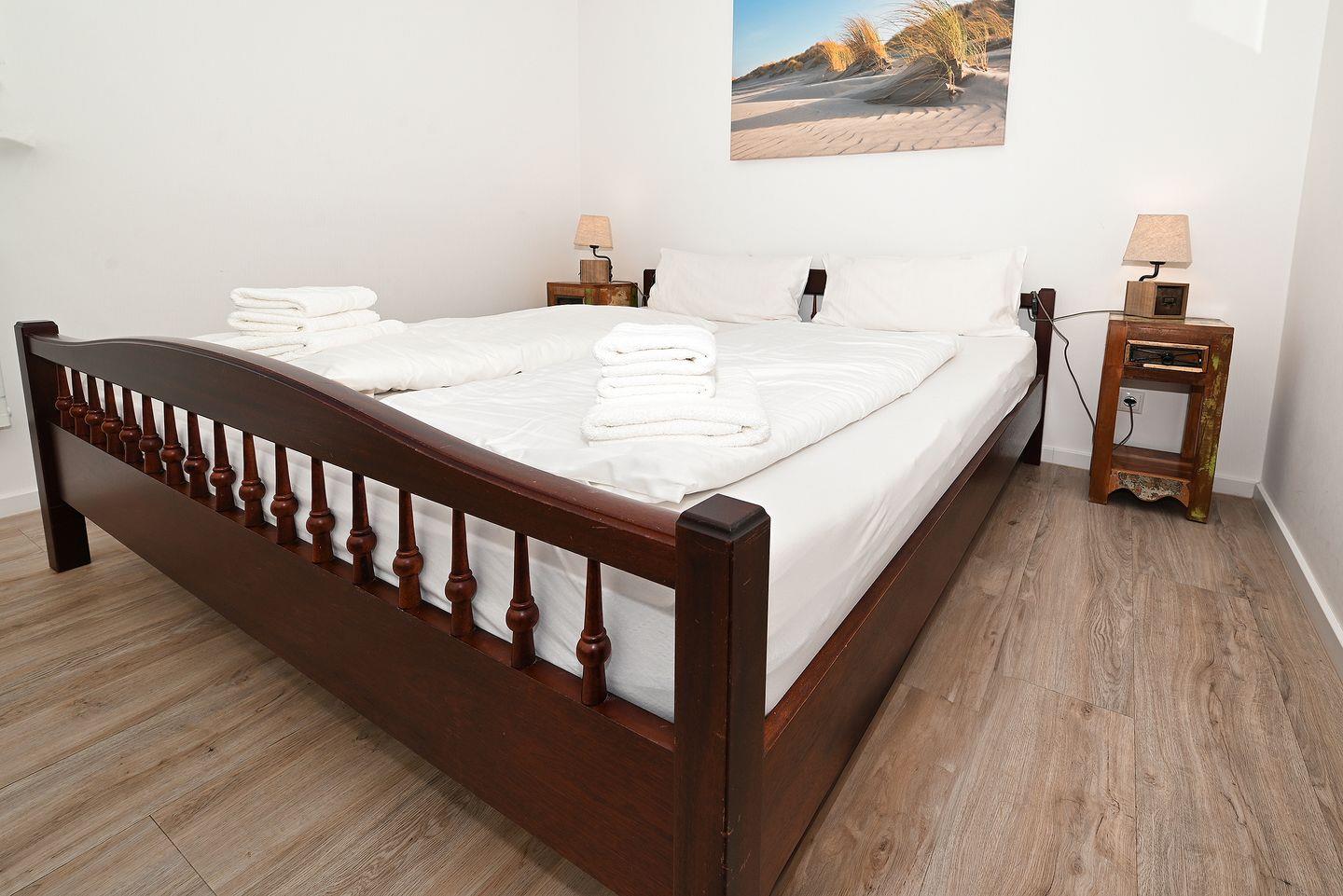 Zwei Personen schlafen im Schlafzimmer mit Doppelbett, zwei auf dem gemütlichen Schlafsofa im Wohnzimmer. Von beiden Zimmern aus können Sie den Blick auf die Nordsee genießen.