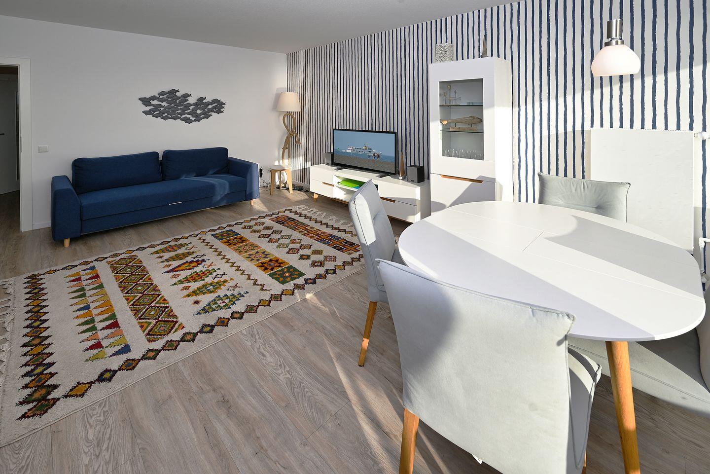 WLAN und Fernseher in Wohn- und Schlafzimmer sorgen für schöne Stunden auch bei schlechtem Wetter.