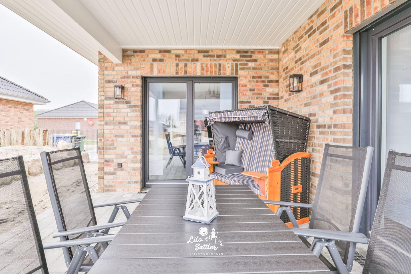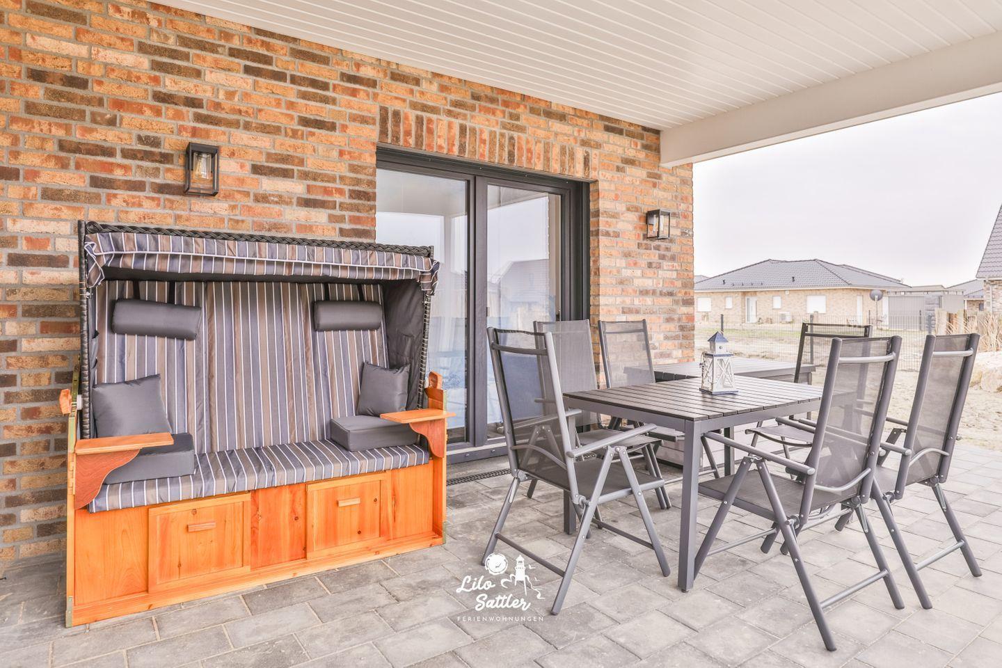 Die Terrasse mit Gartenmöbel und XL Strandkorb laden dazu ein, die frische Nordseeluft zu genießen.