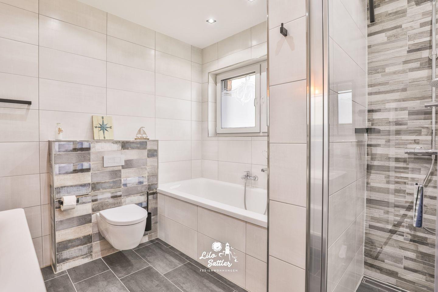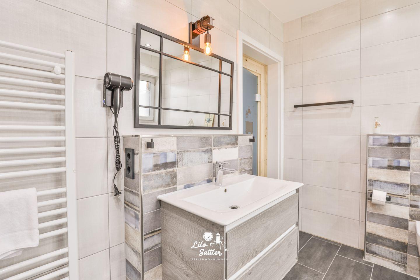 Bad en suite : Badewanne, ebenerdige Dusche, WC, Waschbecken mit Unterschrank, Fenster mit Sichtschutz, Handtuchtockner, Haartrockner, Zugang zur Sauna