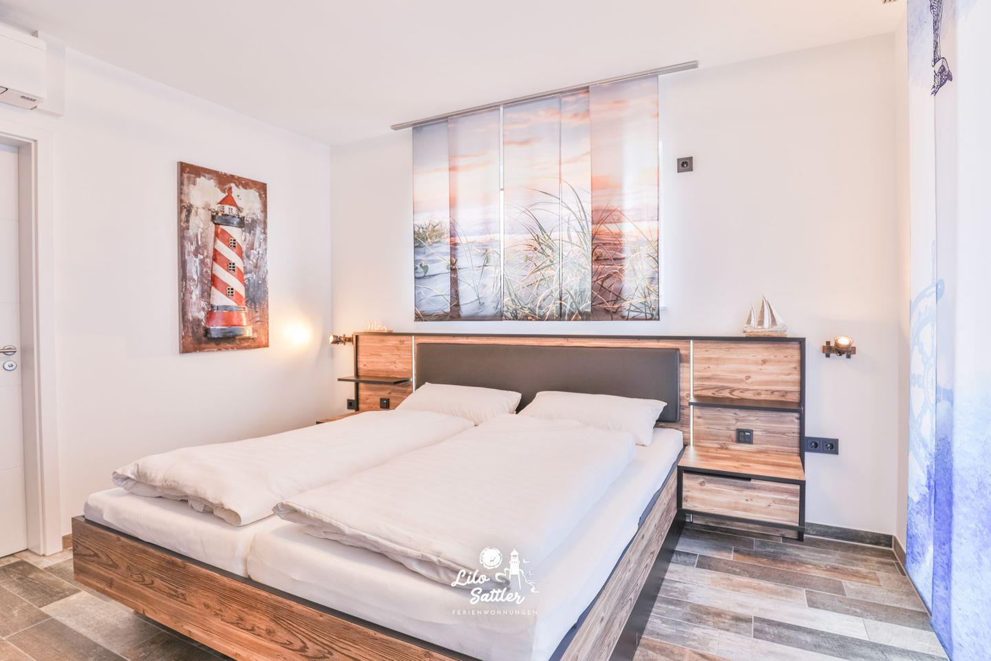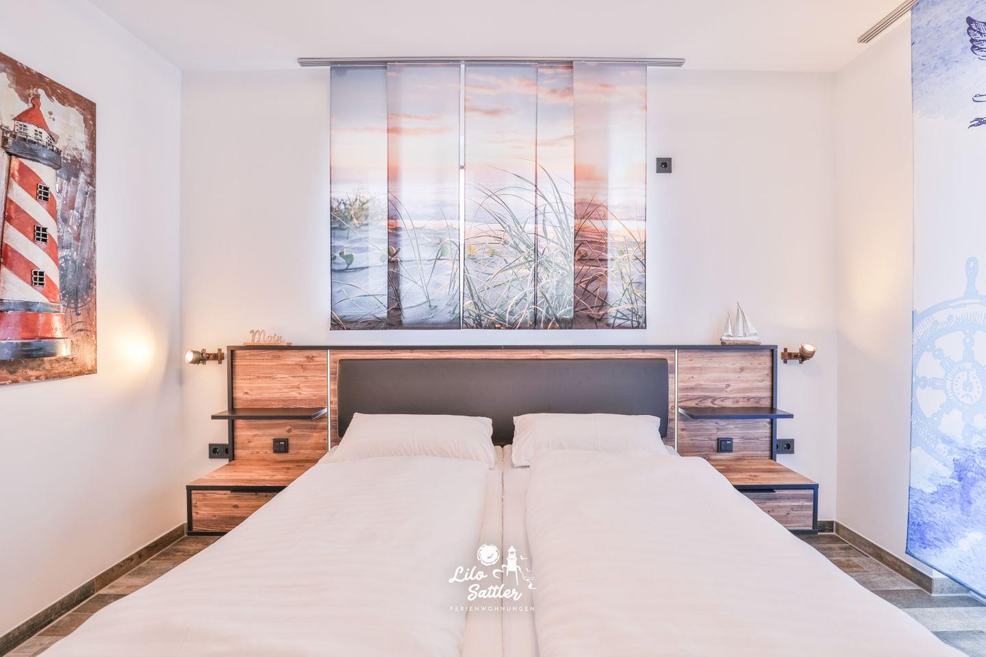 Doppelbett 200x 180 (getrennte Matratzen) mit verstellbaren Lattenrosten, Nachttische mit Lampen, Kleiderschrank, Ganzkörperspiegel, Sessel, Flachbild-Smart-TV, Schiebevorhang,