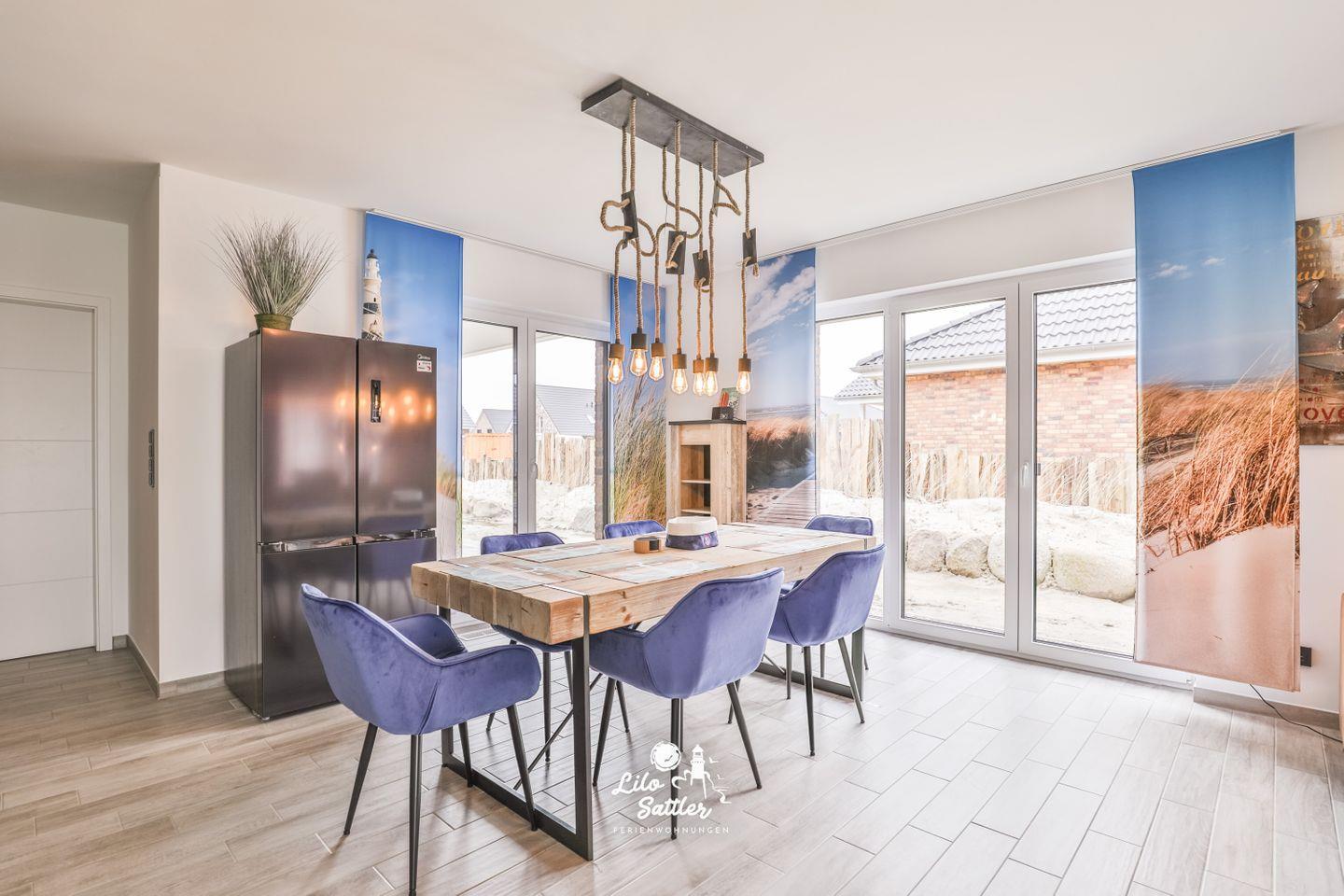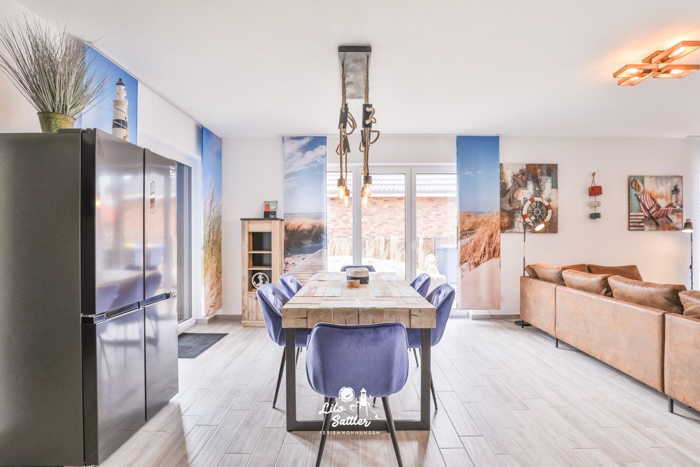 großes gemütliches Sofa, Sessel, Flachbild-Smart-TV, Esstisch mit 6 Stühlen, Digitalradio, Schiebegardinen, Zugang zur Terrasse und zum Garten