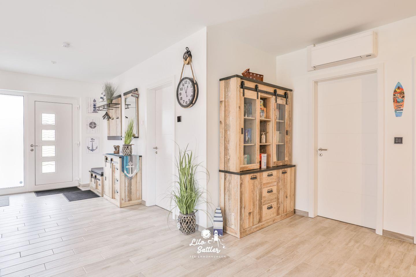 Barrierearm, W-LAN, Klimaanlage und elektrische Aussenrollos in allen Wohnräumen, kostenloser Parkplatz, Fußbodenheizung, großer eingezäunter Garten mit überdachter Terrasse, Gartenmöbel, XL Strandkorb, Dyson Staubsauger, Fahrradschuppen abschließbar, Abstellkammer mit Wäscheständer, Bügeleisen und Bügelbrett, Bettwäsche und Handtücher optional dazu buchbar