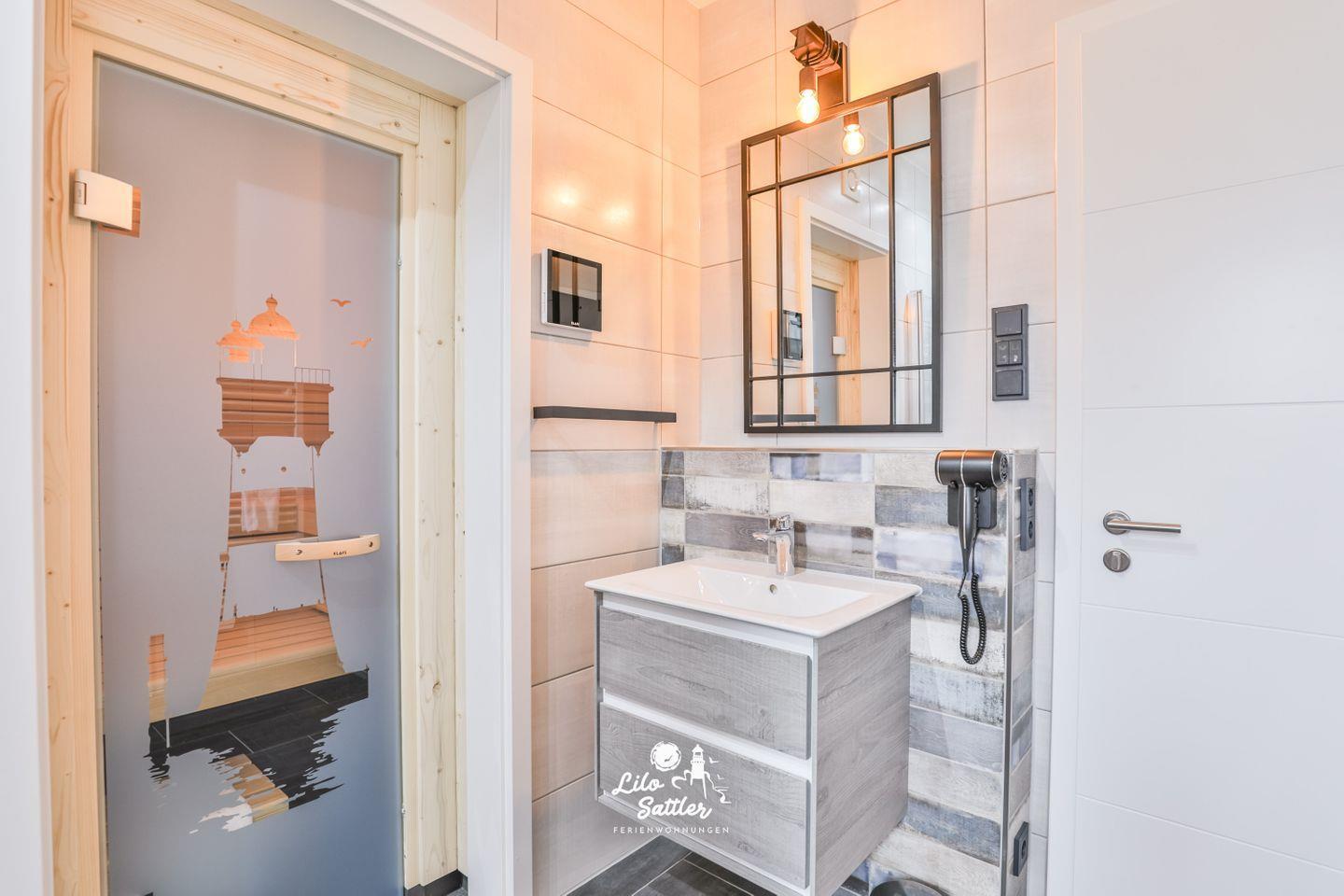 Bad en suite : ebenerdige Dusche, WC, Waschbecken mit Unterschrank, Fenster mit Sichtschutz, Handtuchtrockner, Haartrockner, Zugang zur Sauna, Bedienpaneel Sauna