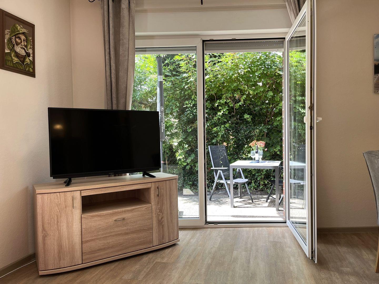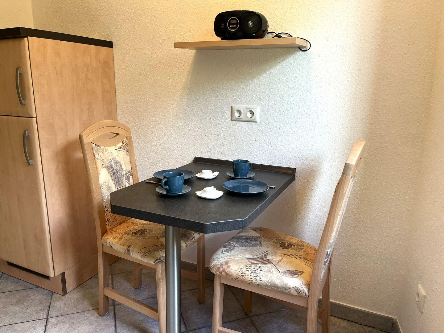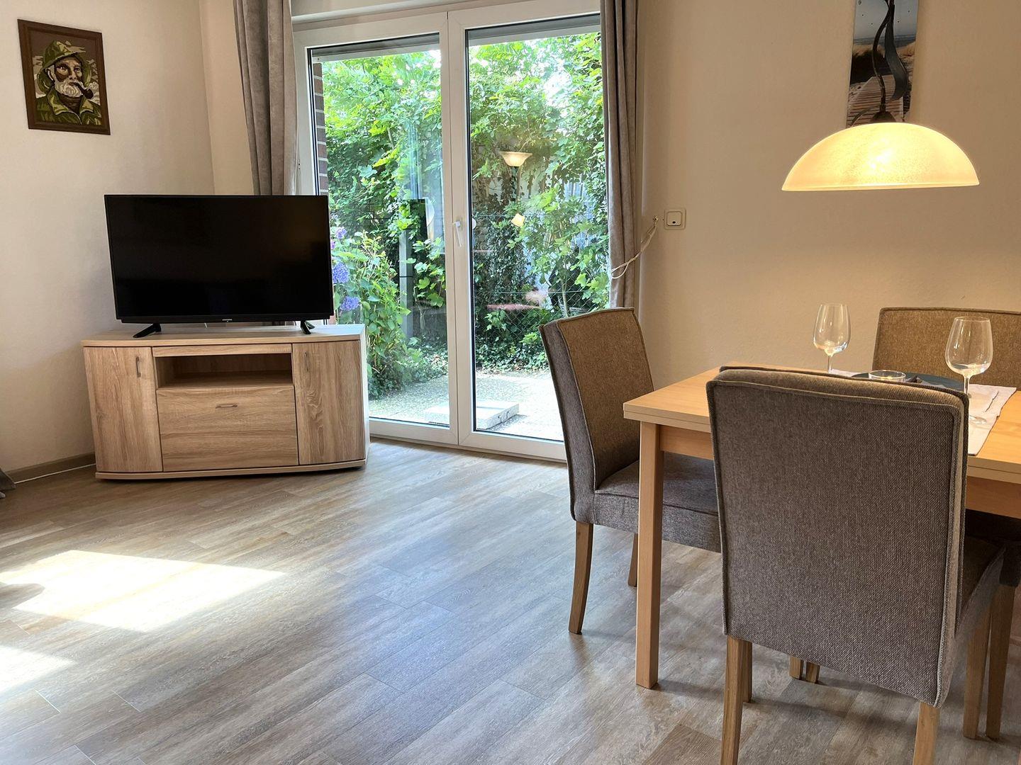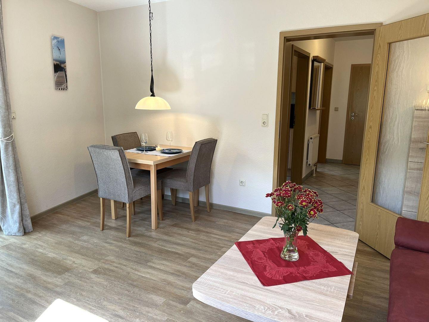 In dem hellen Wohn- Essbereich stehen Ihnen eine Couch und ein Sessel zum Entspannen zur Verfügung. Ein Esstisch, an dem Sie Ihre regionalen Köstlichkeiten genießen können, befindet sich ebenfalls in diesem Raum. Von dort aus geht es zur kleinen Sonnenterasse.