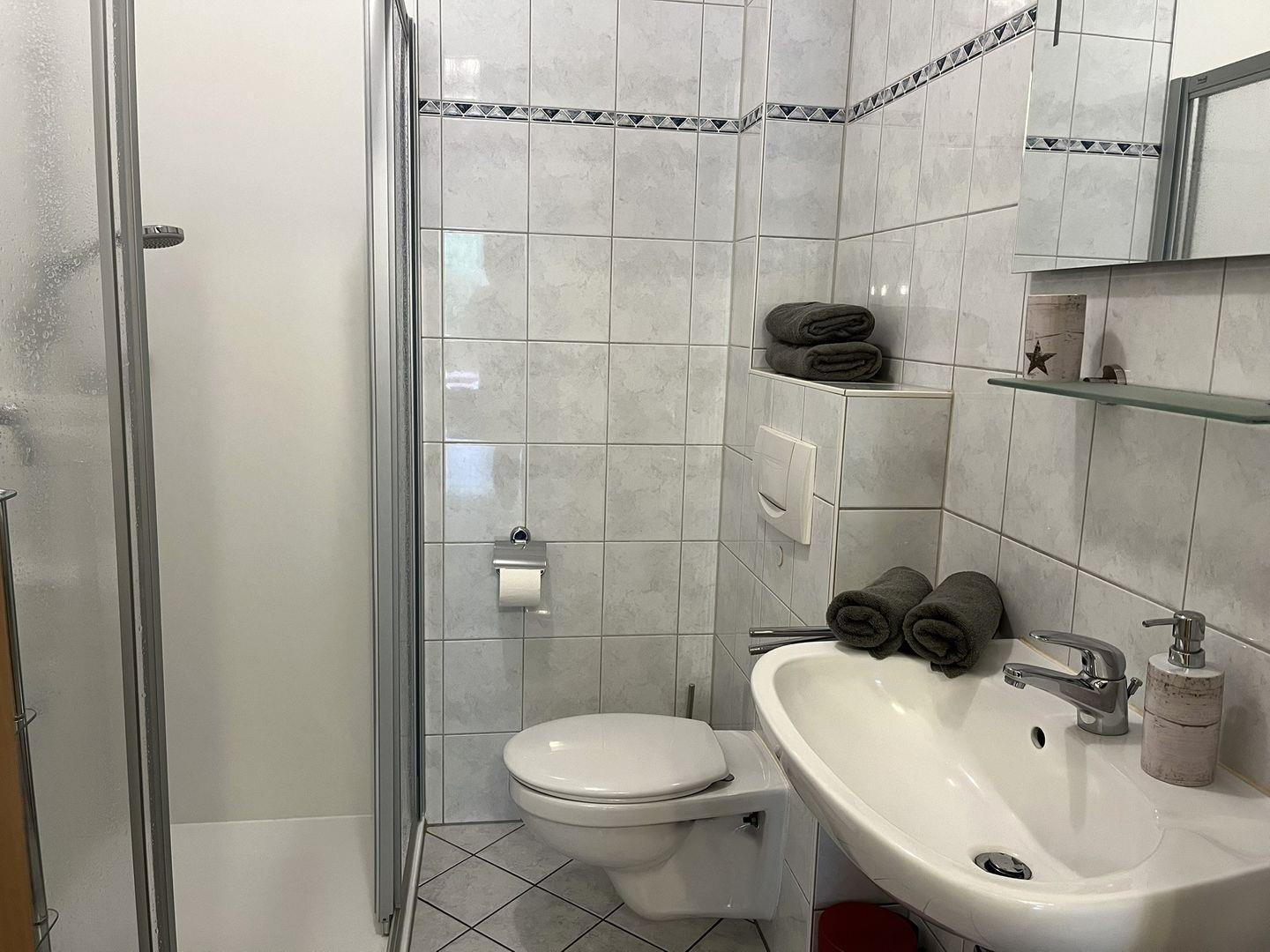 Das Duschbad mit beleuchtetem Spiegel und einer Dusche mit niedrigem Einstieg vollendet die Wohnung.