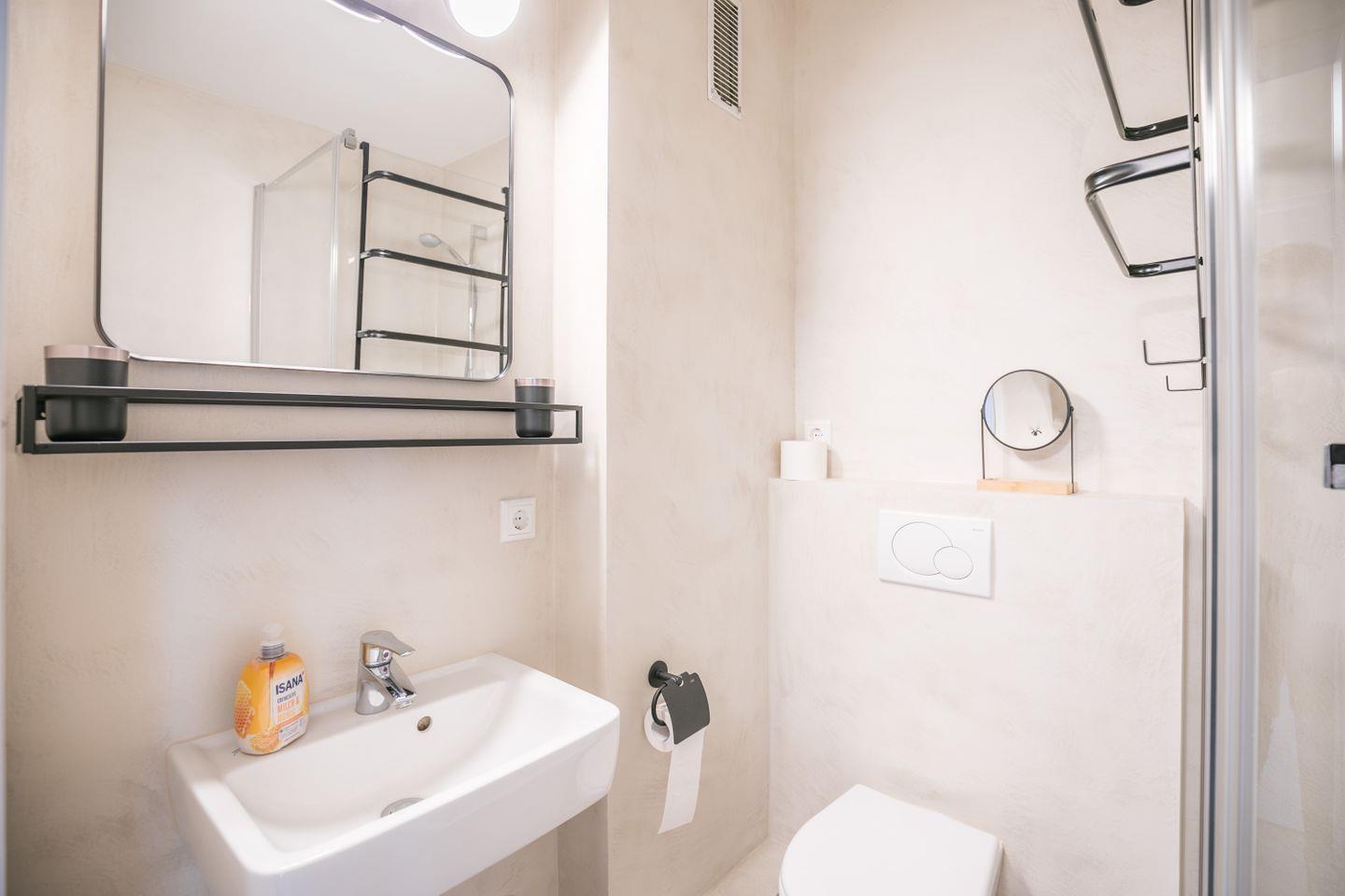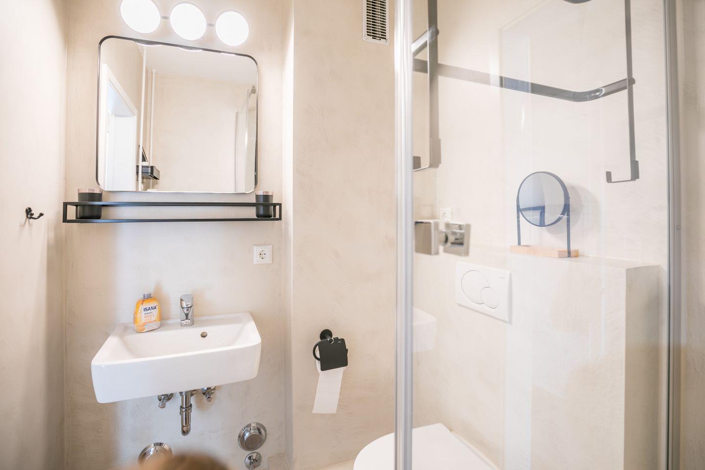 Eckdusche mit Glasabtrennung, Waschbecken mit Spiegel und Ablage, WC, Kosmetikspiegel, Handtuchhalter am Heizkörper, Fön, Abluft