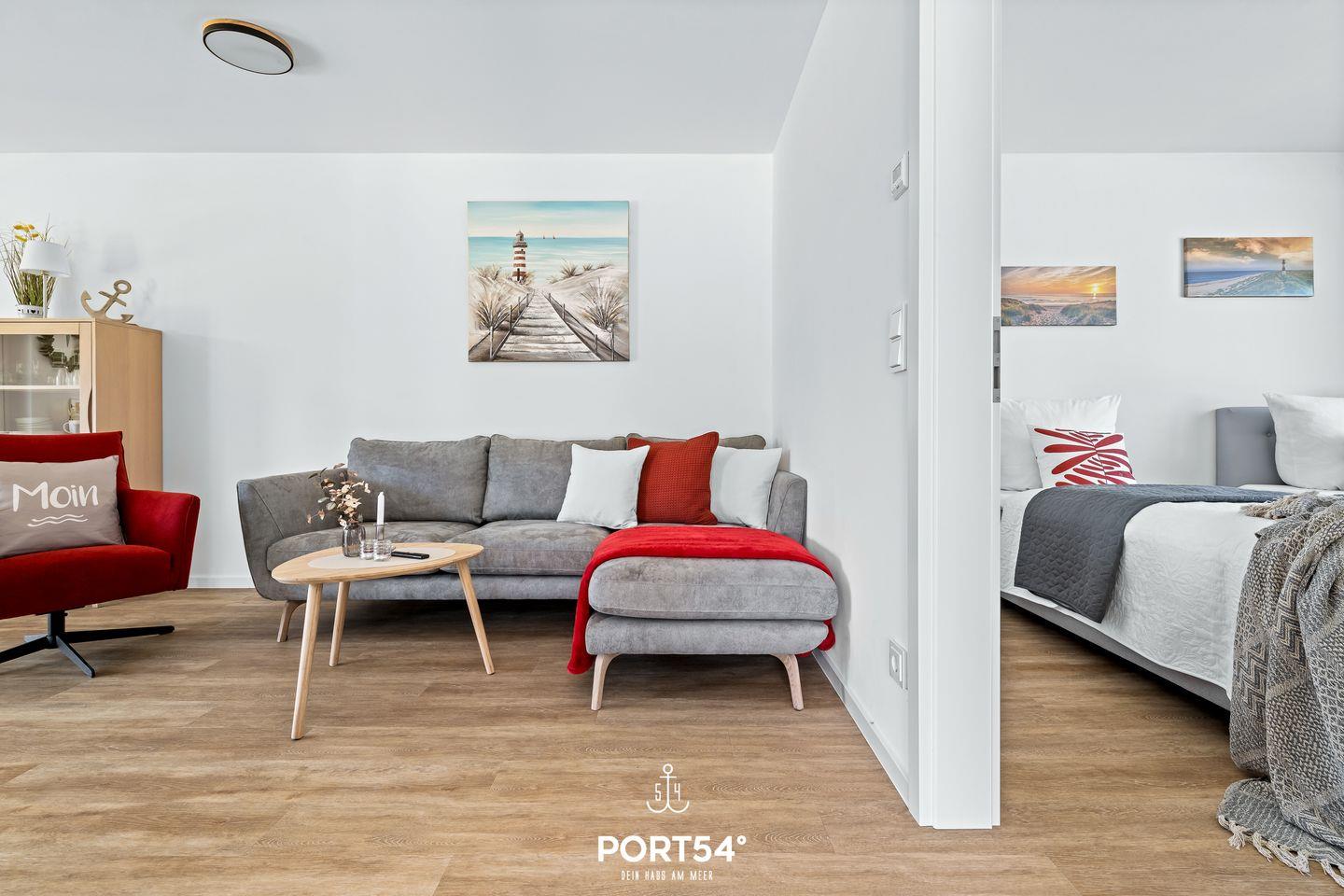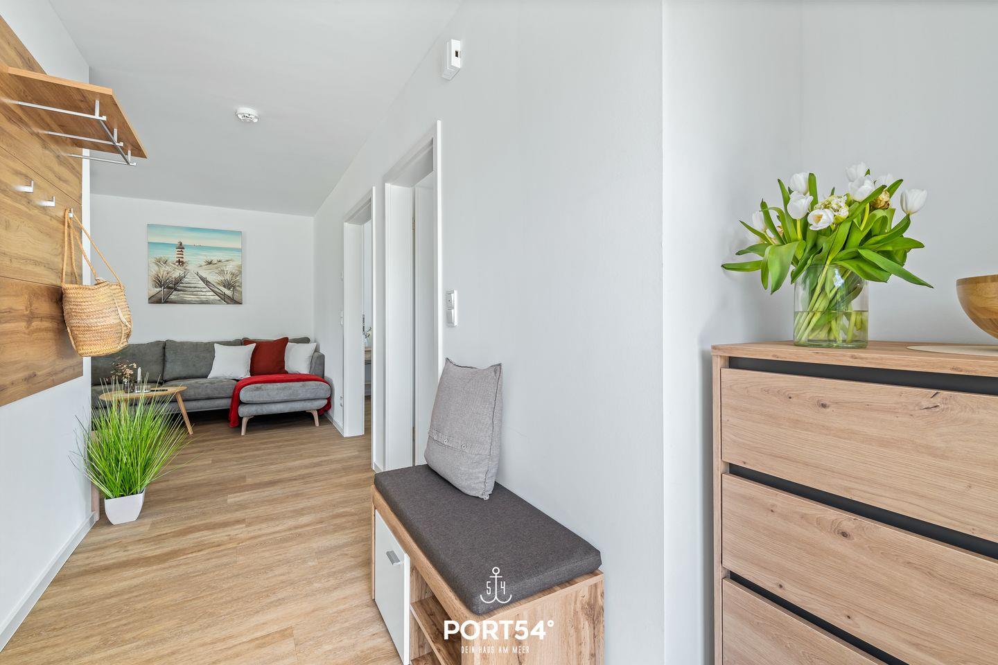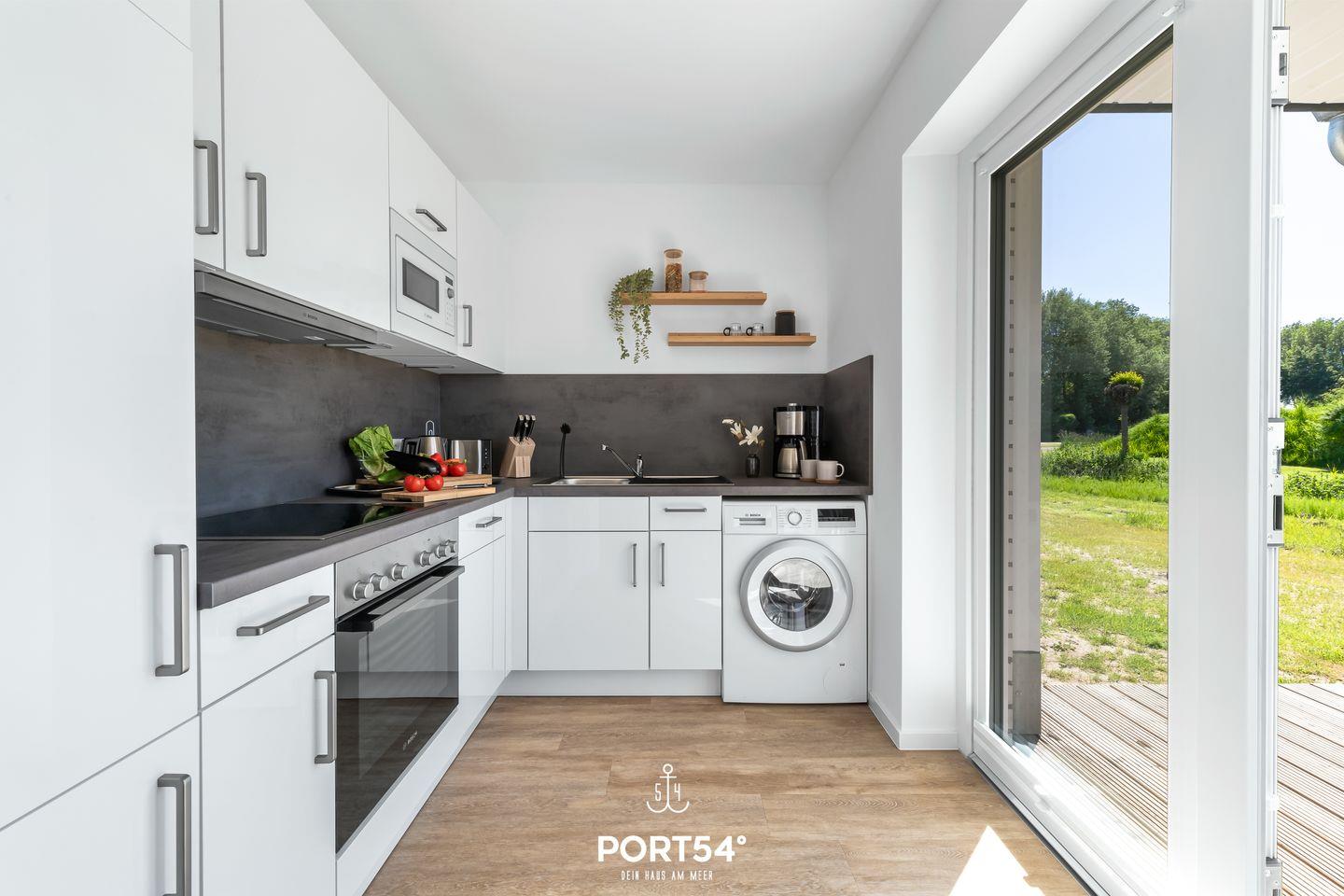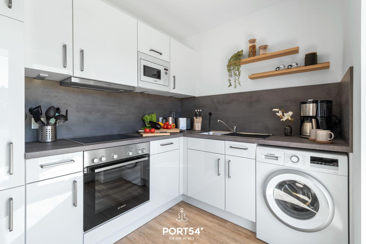 Schon beim Betreten der Wohnung überzeugt das lichtdurchflutete Wohnkonzept. Die zum Wohnbereich offene Küche ist modern und hochwertig mit Waschmaschine, Geschirrspüler, Kaffeemaschine, Wasserkocher, Toaster und Mikrowelle ausgestattet.