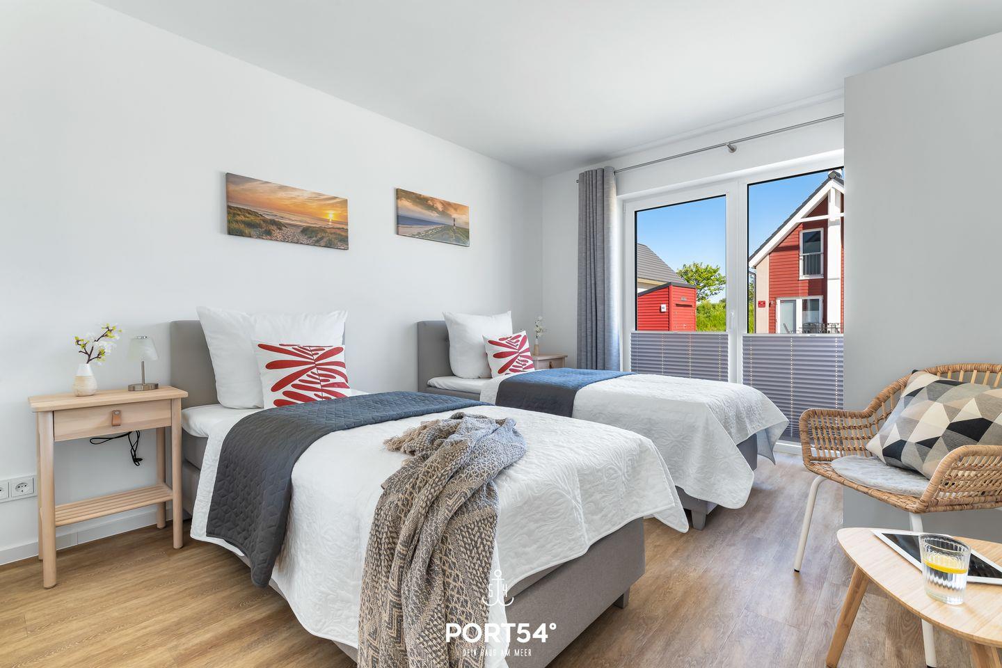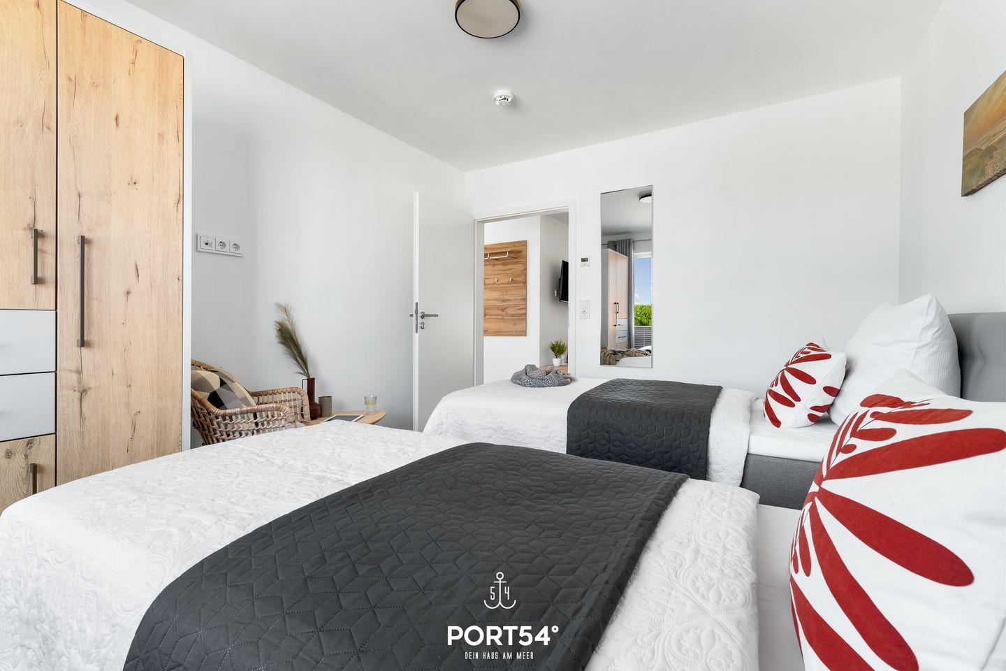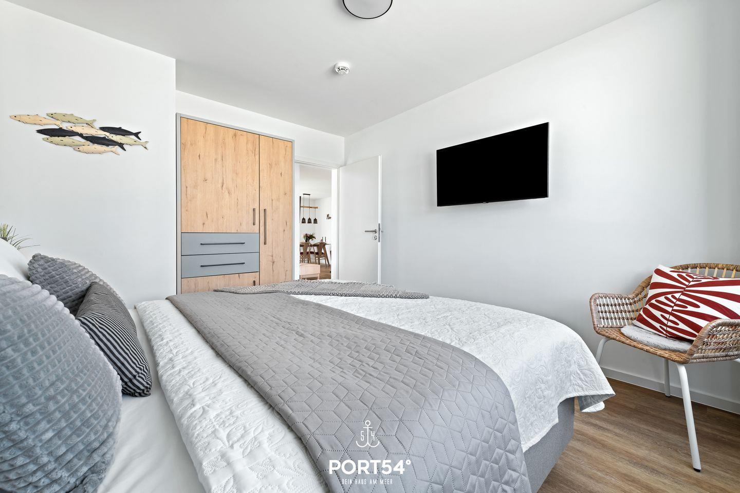 Die Ferienwohnung verfügt über zwei Schlafzimmer, die mit hochwertigen Boxspringbetten ausgestattet sind. In einem der Schlafzimmer befindet sich ein Doppelboxspringbett (180x200cm) und ein Smart-TV. Das zweite Schlafzimmer ist mit 2 Einzelboxspringbetten (90x200cm) ausgestattet. In beiden Schlafzimmern befinden sich Plissees mit Verdunkelungsmöglichkeit.