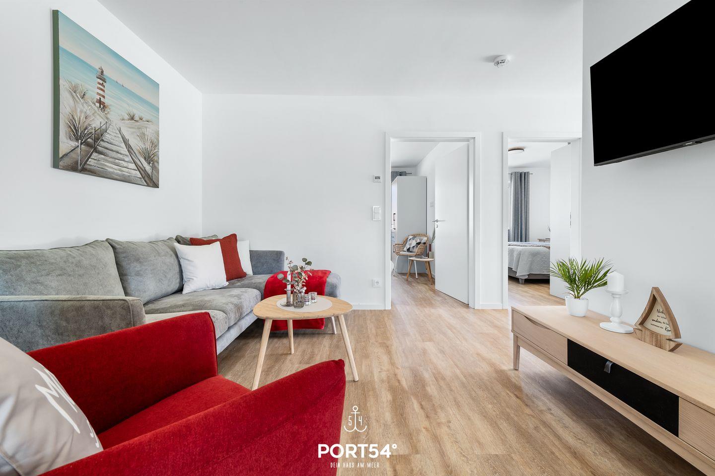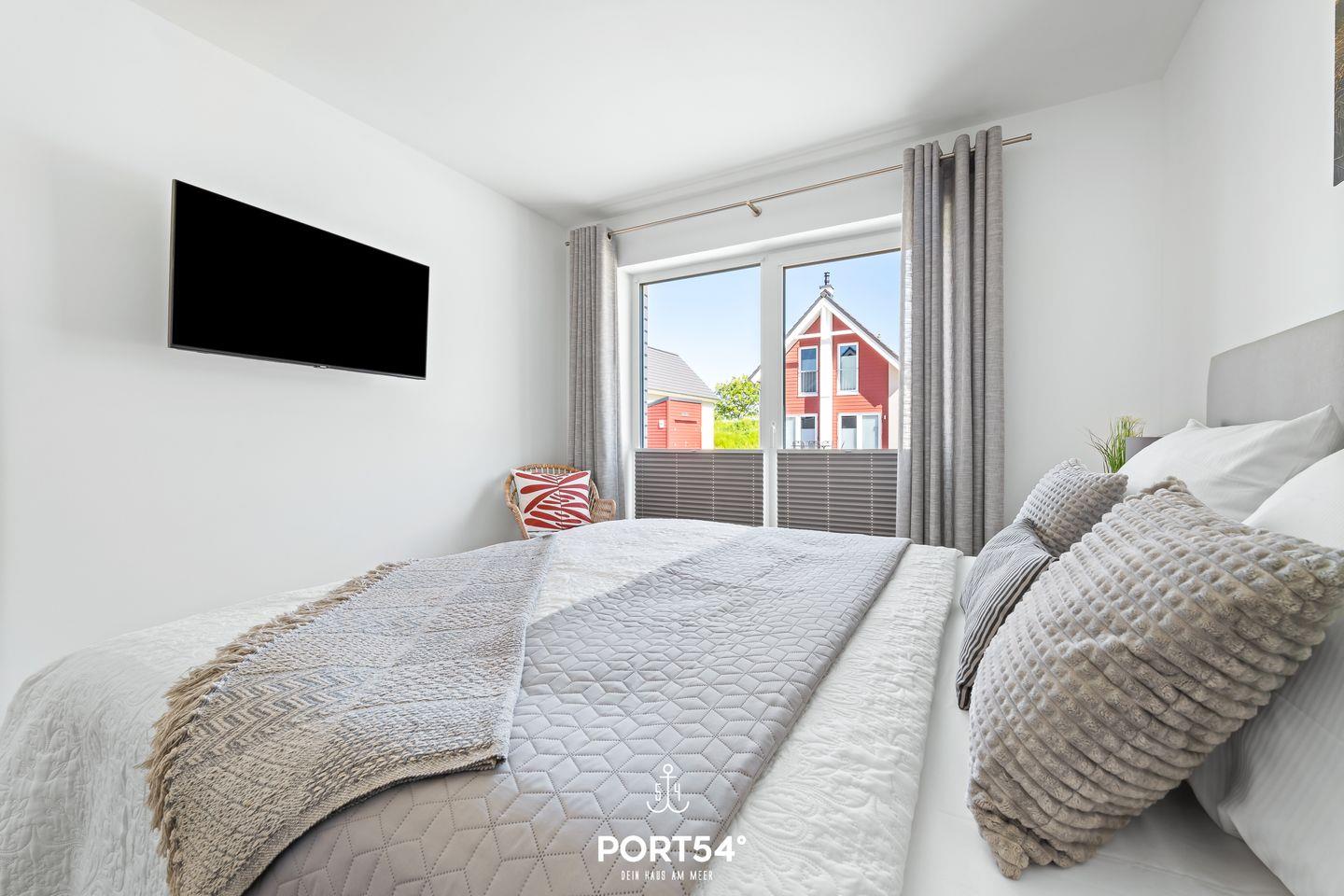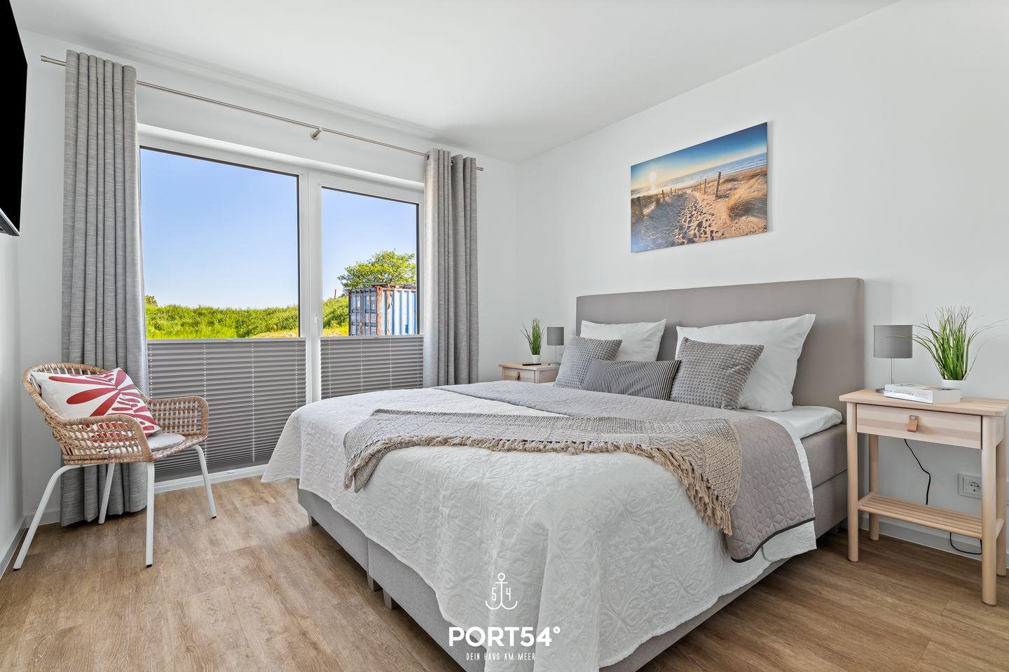 Die Ferienwohnung verfügt über zwei Schlafzimmer, die mit hochwertigen Boxspringbetten ausgestattet sind. In einem der Schlafzimmer befindet sich ein Doppelboxspringbett (180x200cm) und ein Smart-TV. Das zweite Schlafzimmer ist mit 2 Einzelboxspringbetten (90x200cm) ausgestattet. In beiden Schlafzimmern befinden sich Plissees mit Verdunkelungsmöglichkeit.
