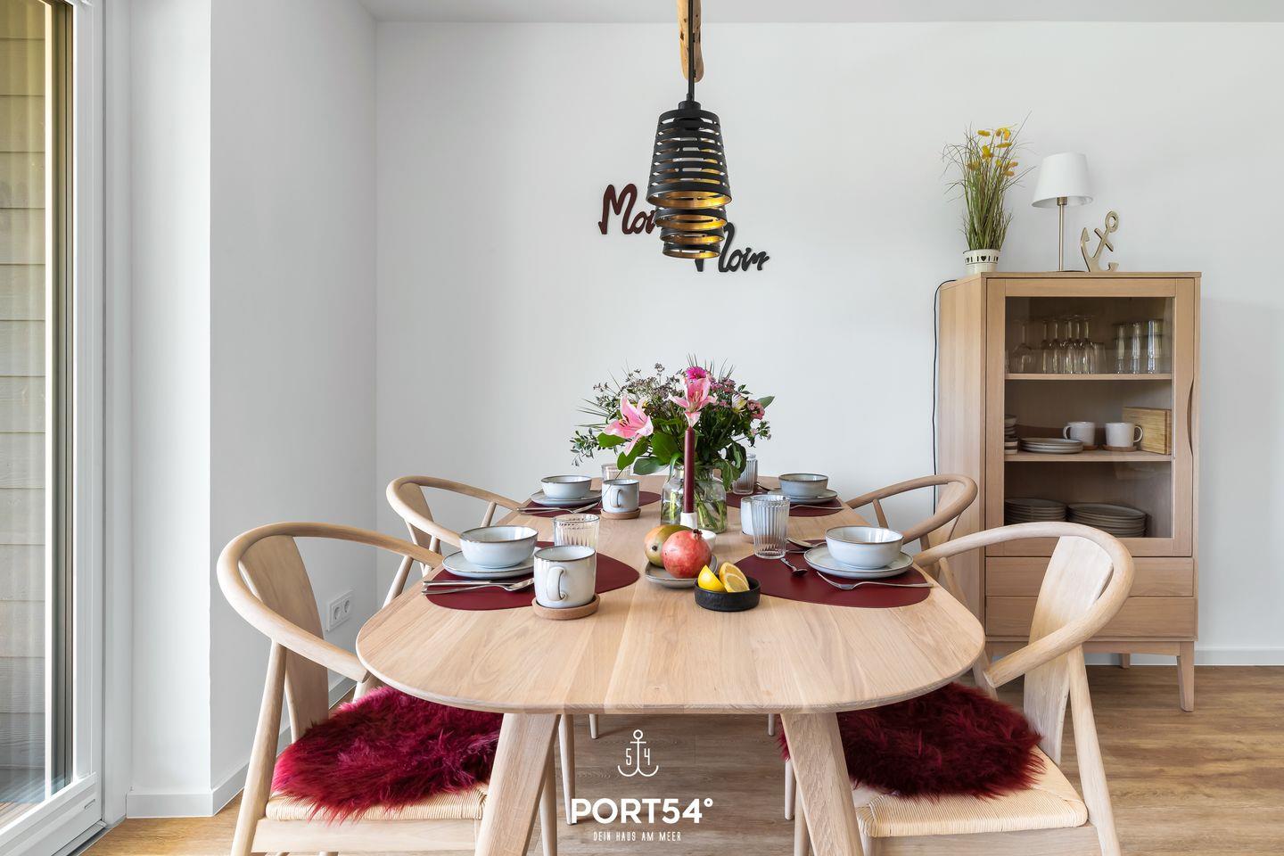 Das großzügige Wohnzimmer mit Kamin, Gesellschaftsspielen und Smart-TV lädt mit Sofa und einem Sessel zum Verweilen ein. Im Essbereich steht für die kleinen Gäste ein Kinderhochstuhl zur Verfügung.