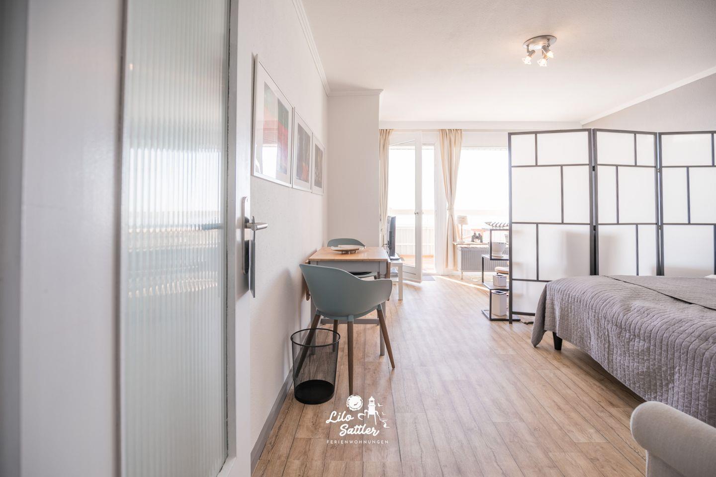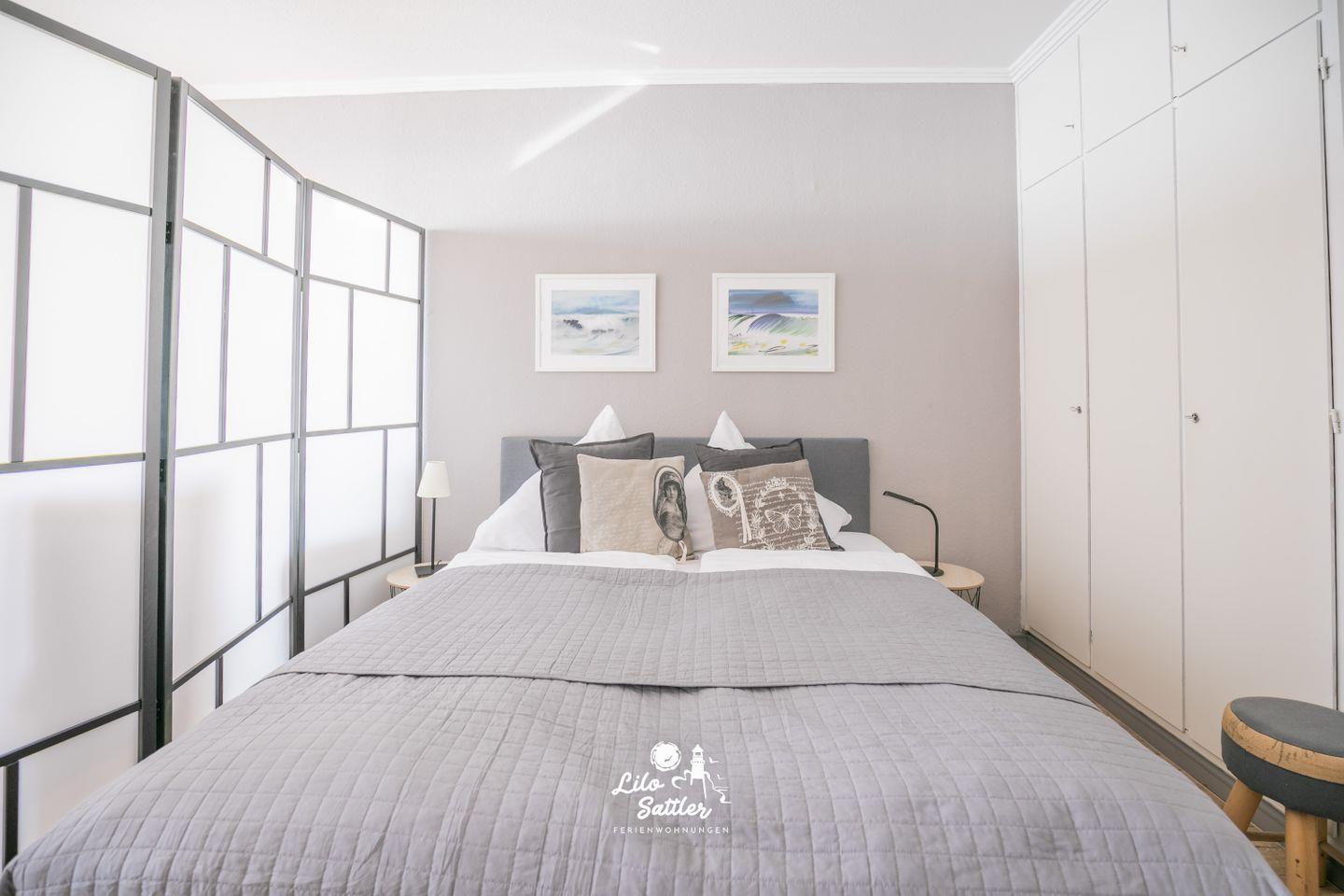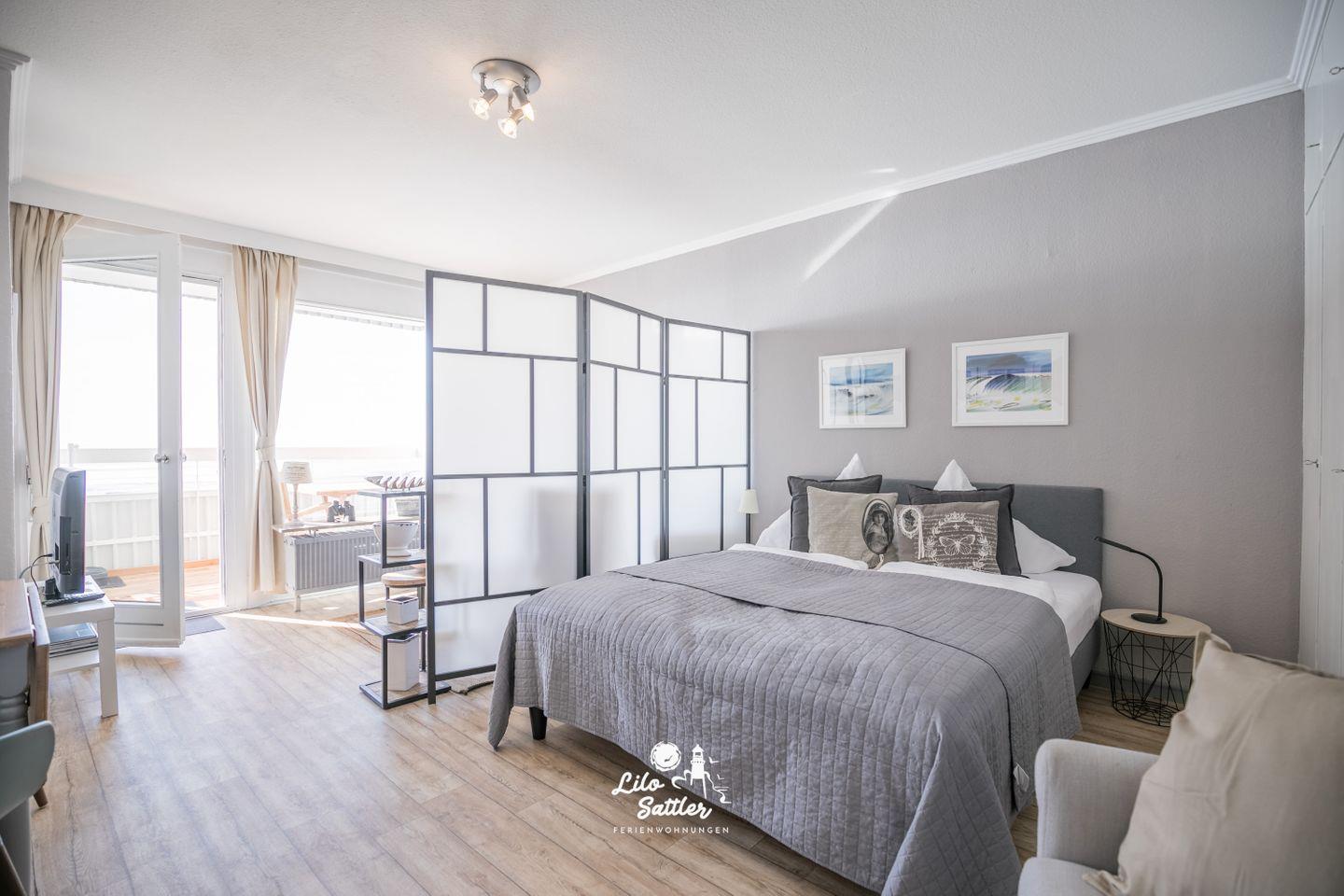 Das Appartement verfügt über einen Wohn-/Schlafbereich mit gemütlichem Sofa und bequemen Boxspringbett. Die Bereiche sind durch einen Paravan getrennt.