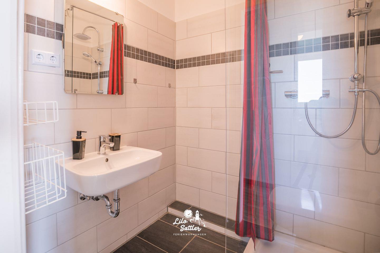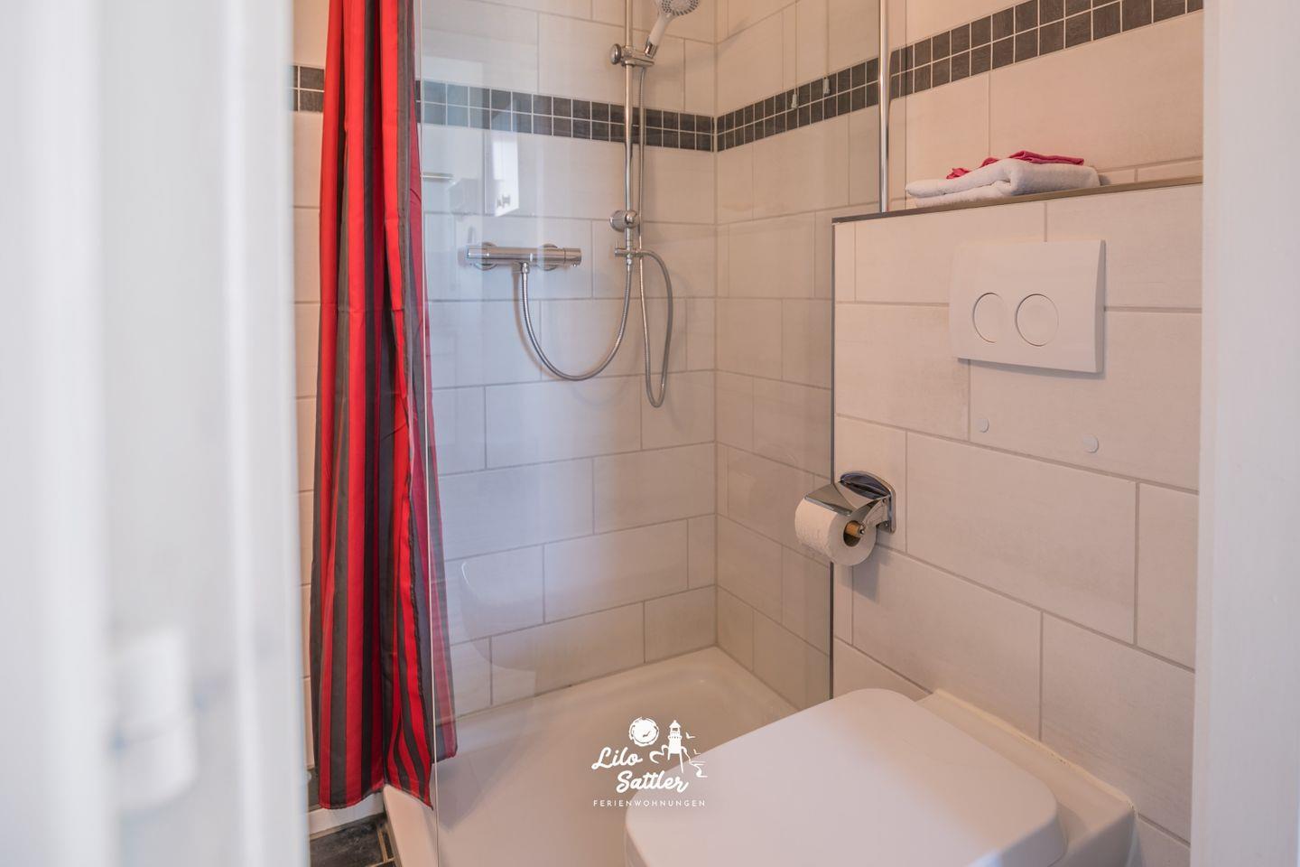 Dusche mit Duschvorhang, WC, Waschbecken, Spiegel mit integriertem Regal, Lüfter