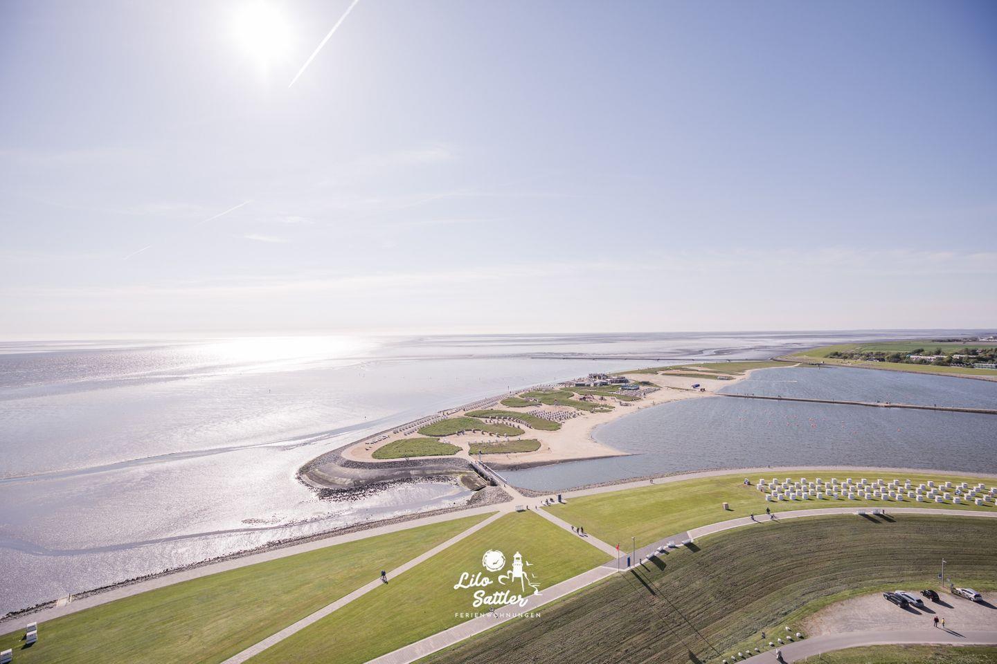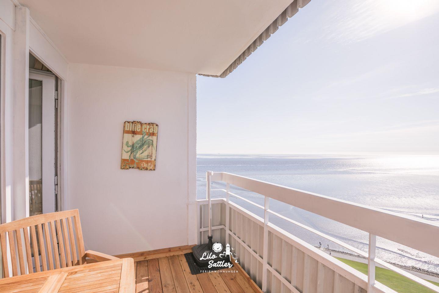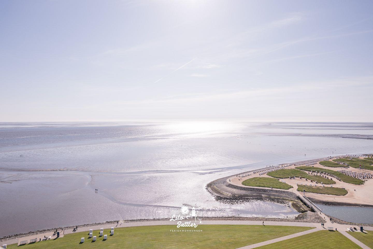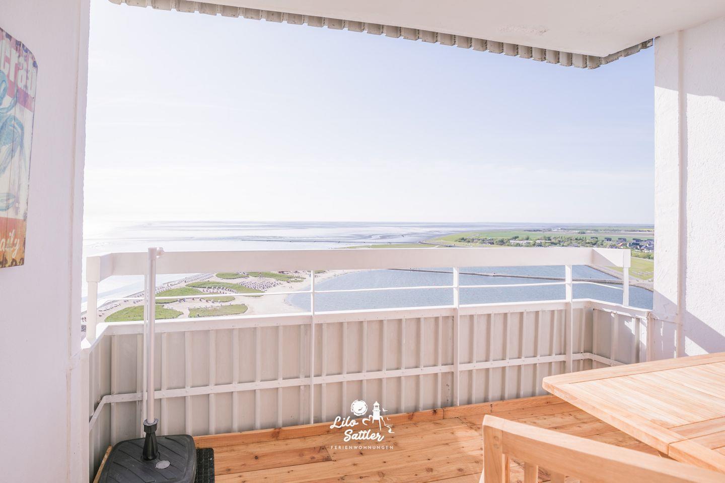 Die Ferienwohnung bietet einen herrlichen Blick auf die Nordsee und die Familienlagune Perlebucht. Genießen Sie auf dem Balkon die frische Meeresluft und atemberaubende Sonnenuntergänge. Über ein paar Treppenstufen sowie über einem stufenlosen Nebeneingang sind die Eingänge zum Hochhaus erreichbar.