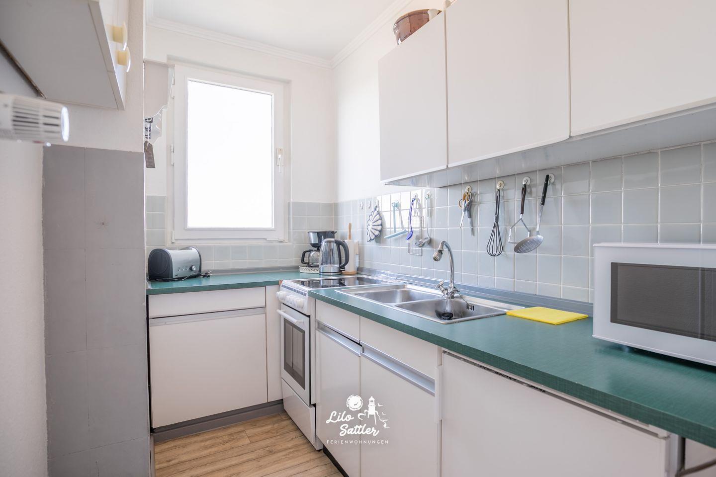 Herd mit Ceranfeld und Backofen, Kühlschrank mit Gefrierfach, Mikrowelle, Kaffeemaschine, Toaste, Wasserkocher, Fenster