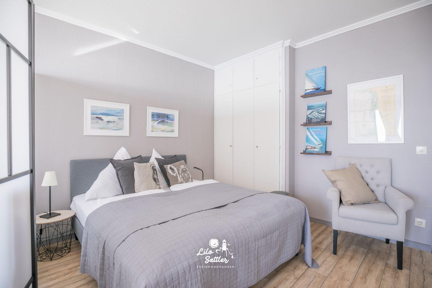Boxspringbett 160x 200 (durchgehende Matratze), Nachttische mit Nachttischleuchten, Kleiderschrank 3-türig, Sessel, kleiner Esstisch mit 2 Stühlen